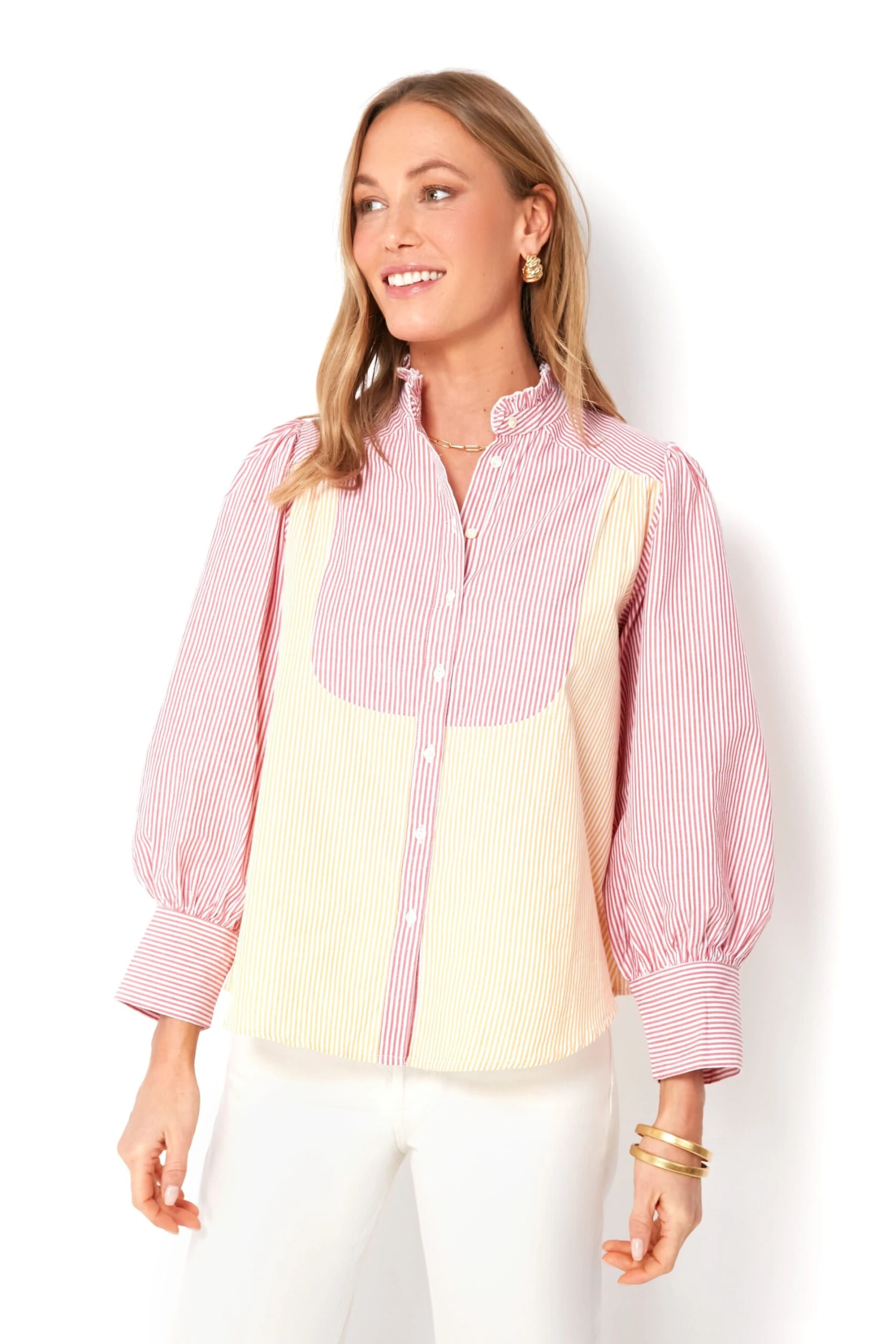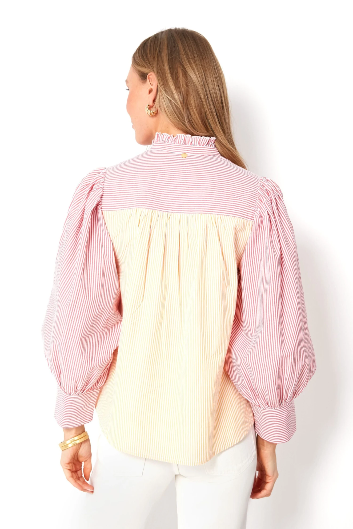 Your classic button down reinvented– meet the Red Polette Blouse. A feminine ruffle collar plays well with the slightly puffed sleeves and button front placket while the red and yellow colorblock stripes add a playful and fun feel. Pair with trousers and flats for a day in the office or play it cool and opt for your favorite denim for an it-girl weekend look.Â