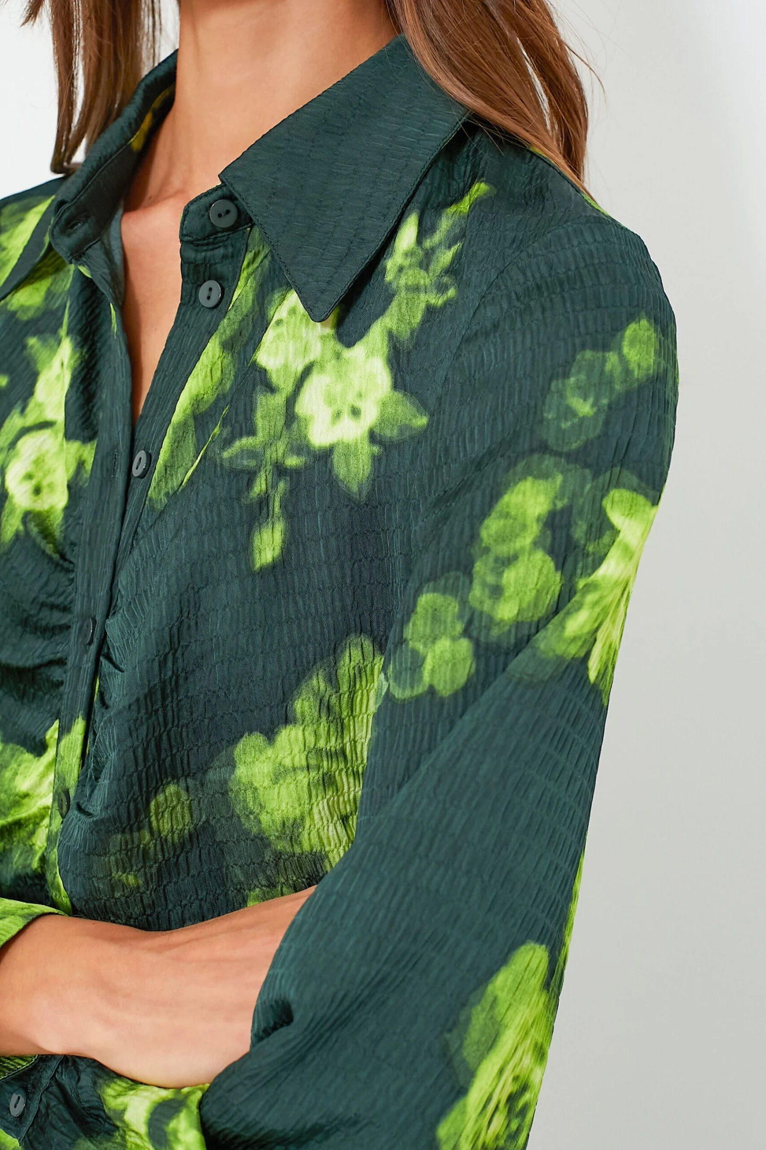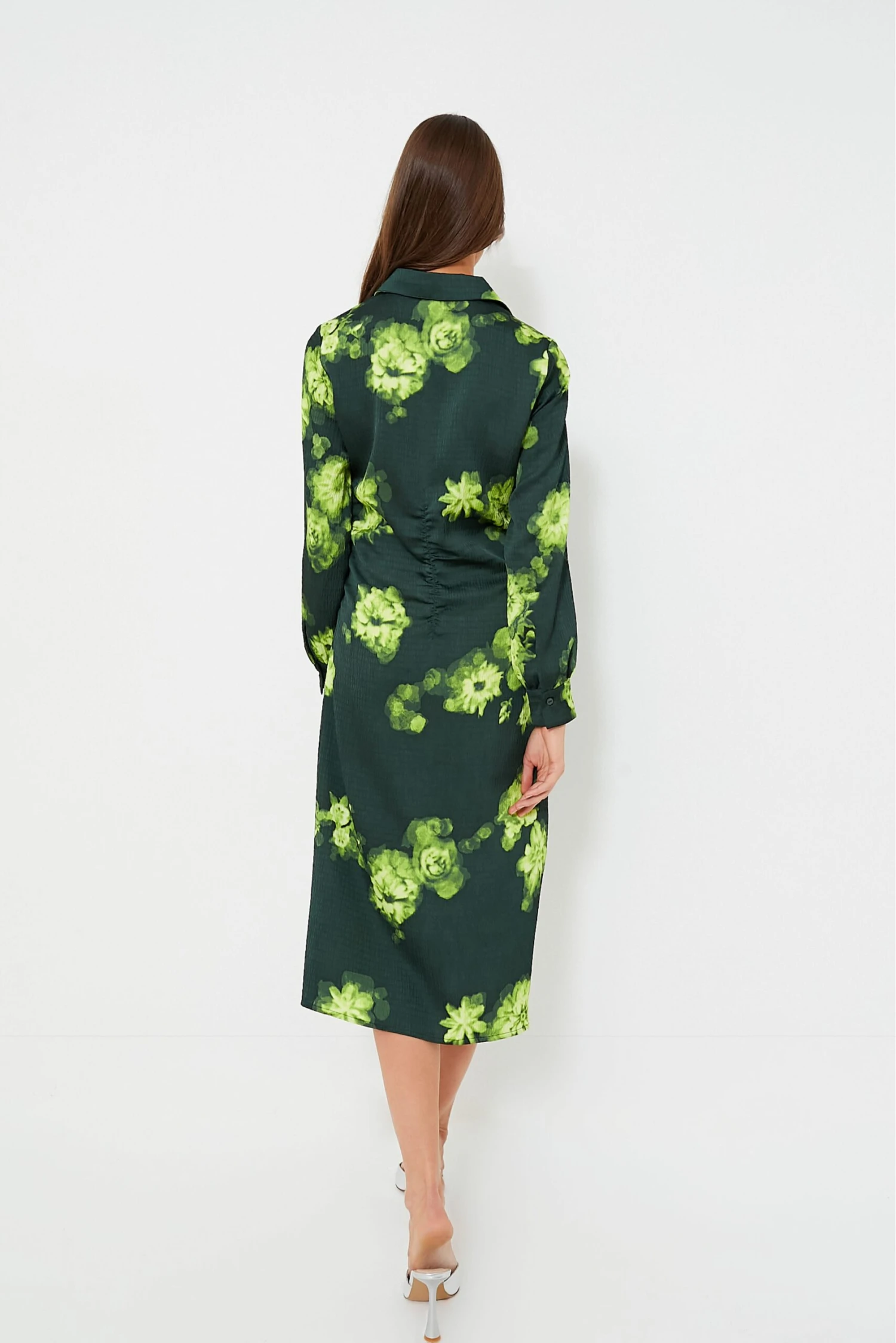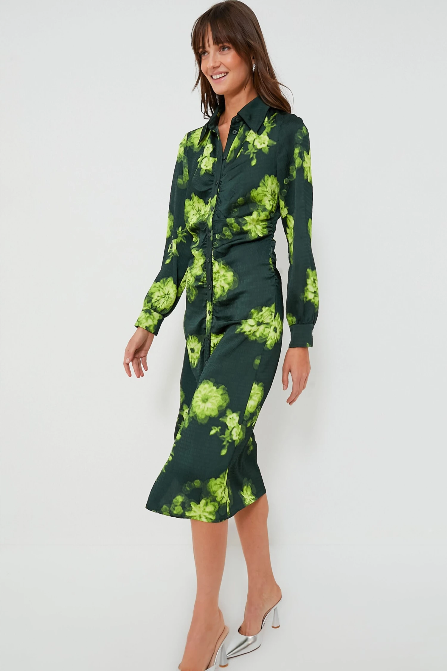 Elevate your style effortlessly with this statement piece – the Margot Flower Abira Dress, perfect for making a lasting impression. Featuring luxe green hue, this midi can be dressed up or down, season after season. This fitted style seamlessly combines sophisticated details like a front button closure, buttoned cuffs and ruching at the sides to give a flattering drape. From sandals to sneakers, heels to flats, we are constantly reaching for this maxi for easy day to night transitions, desk to drinks, and everything else all season long.Â