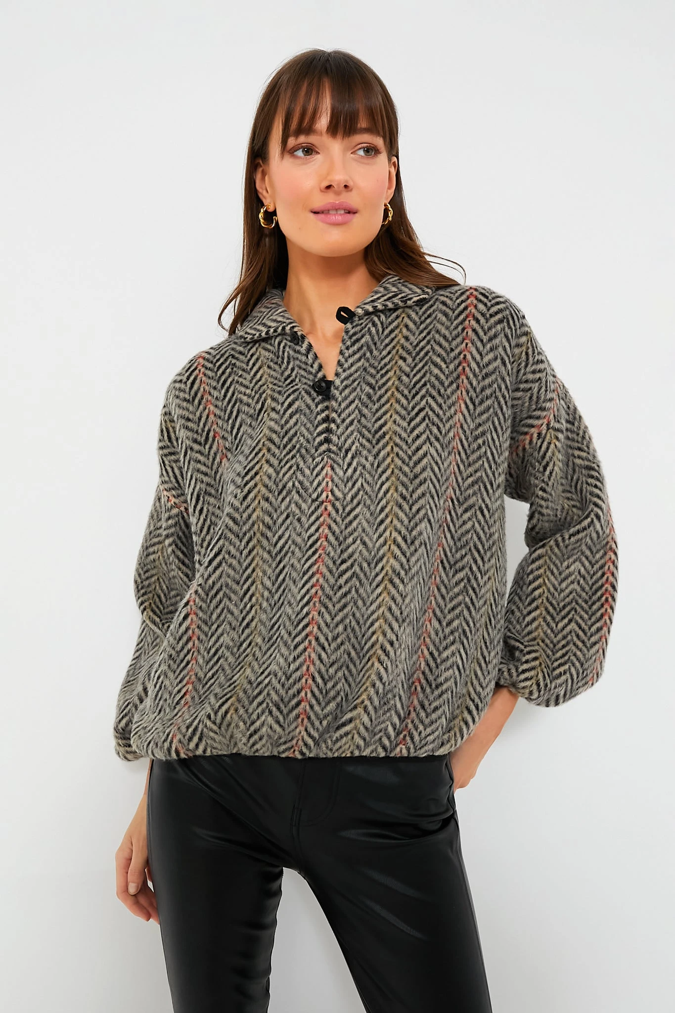 This perfectly slouchy pullover is our favorite vintage-inspired layering piece. Super soft for a season of comfort, the brushed woven body features chevron stripes with unexpected pops of color running throughout. The fit is complete with a button front placket that eases into a collared neckline, subtle blouson sleeves with elasticated binding, and nostalgic details like cotton twill tape loops and real corozo buttons. Pair with knit trousers and sneakers for walks around town, or with black pants and red flats for a fun office look.