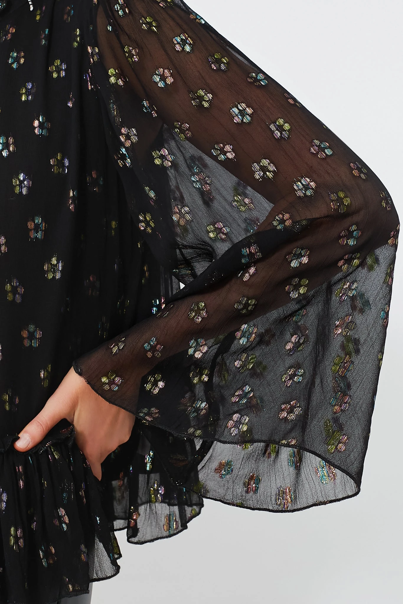 - Material: 100% Georgette, Gold Dot Lurex (detailing)