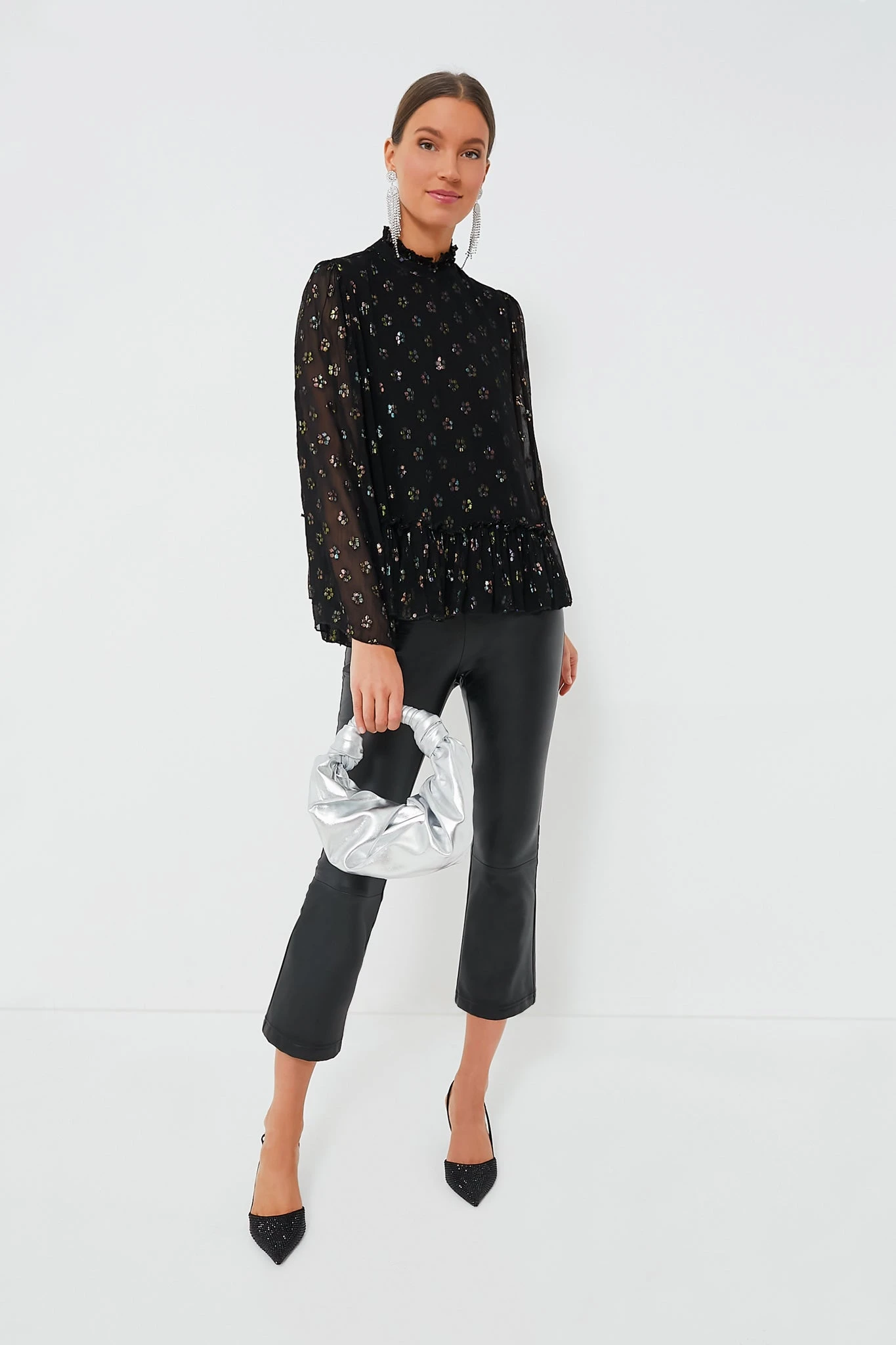 We are loving this subtly-playful Black Kala Peplum Blouse by Oliphant. Complete with a flattering silhouette, textured fabric, and a shimmering design, this top is eye-catching while still being elegant and versatile. The lightweight fabric ensures comfort, while the ruffle collar and hem add dimension and character. Style this with black pants and heels for a formal dinner party, or dress down with denim and ballet flats.