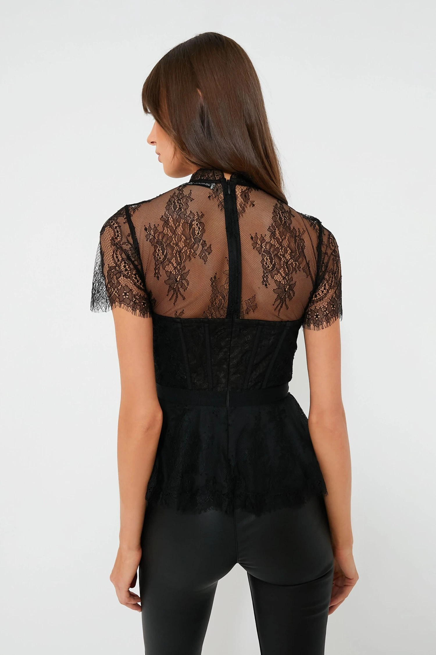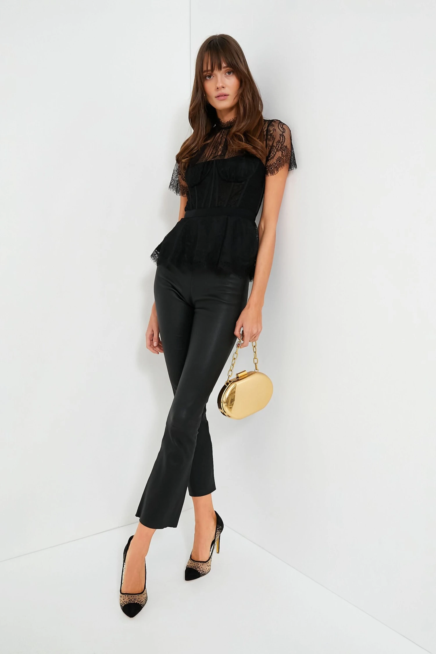 The Black Kehlani Top is made from sheer lingerie lace that enhances the sultry, boudoir-inspired bustier top. A peplum hem, mock-neck collar, and grosgrain ribbon at the waist add a feminine flair. We are adding leather pants and pops of pink for a look that is truly celebration-worthy!