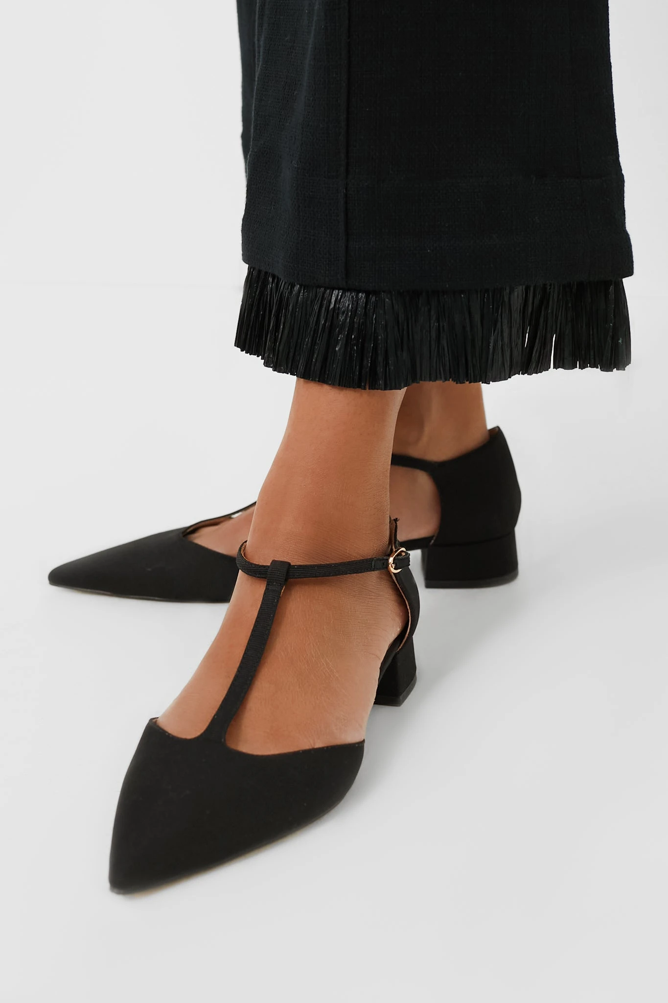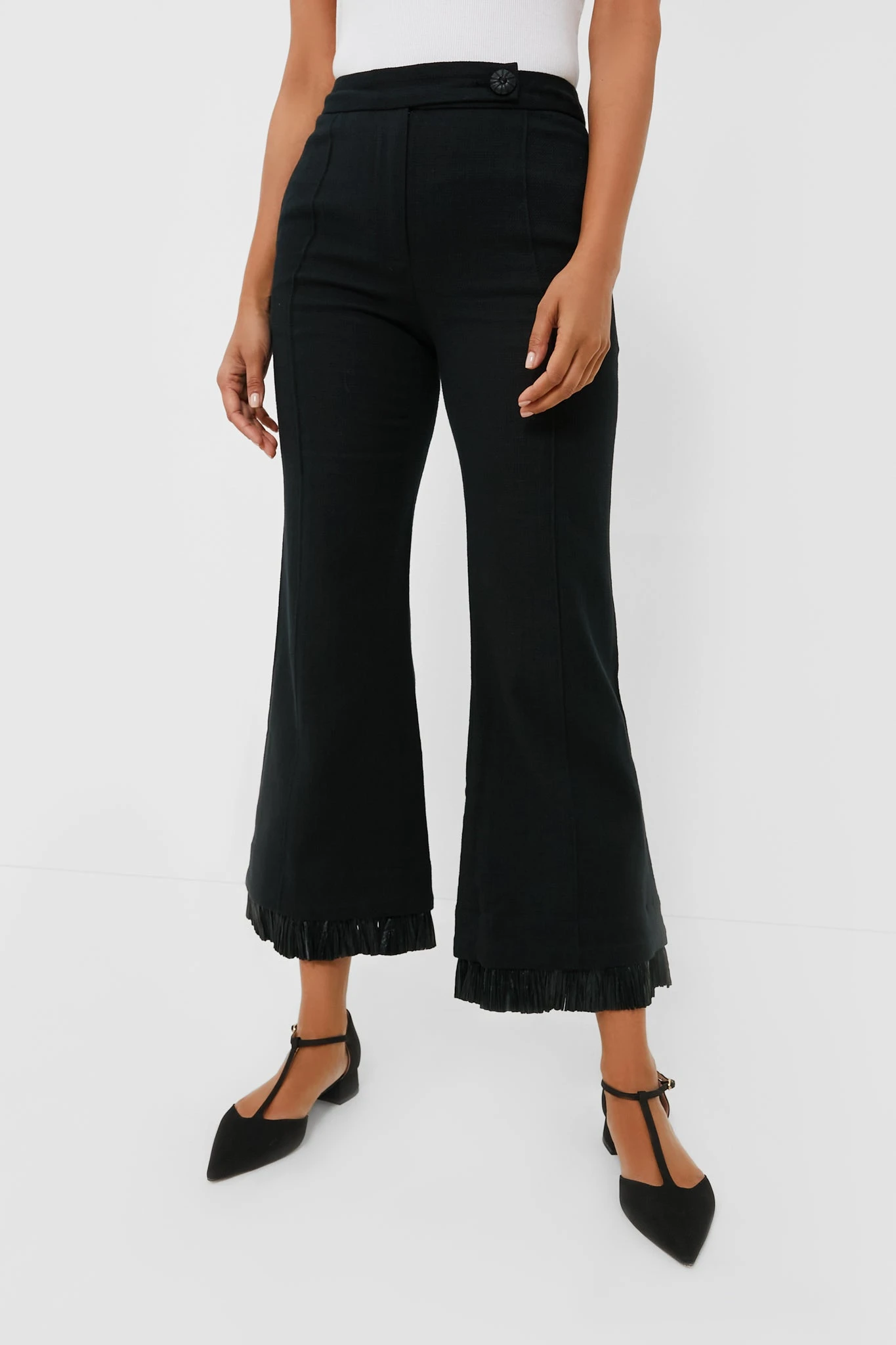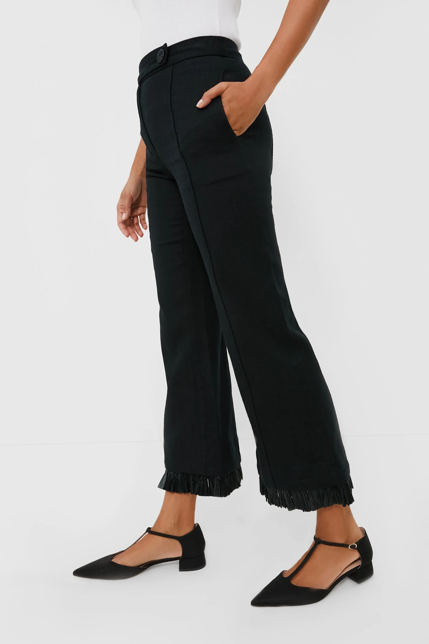 The Black Parker Trousers deliver a playful take on a classic pant silhouette. Beautifully crafted in a textural cotton linen blend, this perfectly tailored style features a mid-rise silhouette with pintucks down the center of the leg and stunning raffia fringing at the hem – a detail you’re sure to love. Go full monochromatic look by wearing them with the matching Black Simona Panelled Top, or style with a sleek blouse and heels for a chic look that’s sure to impress.