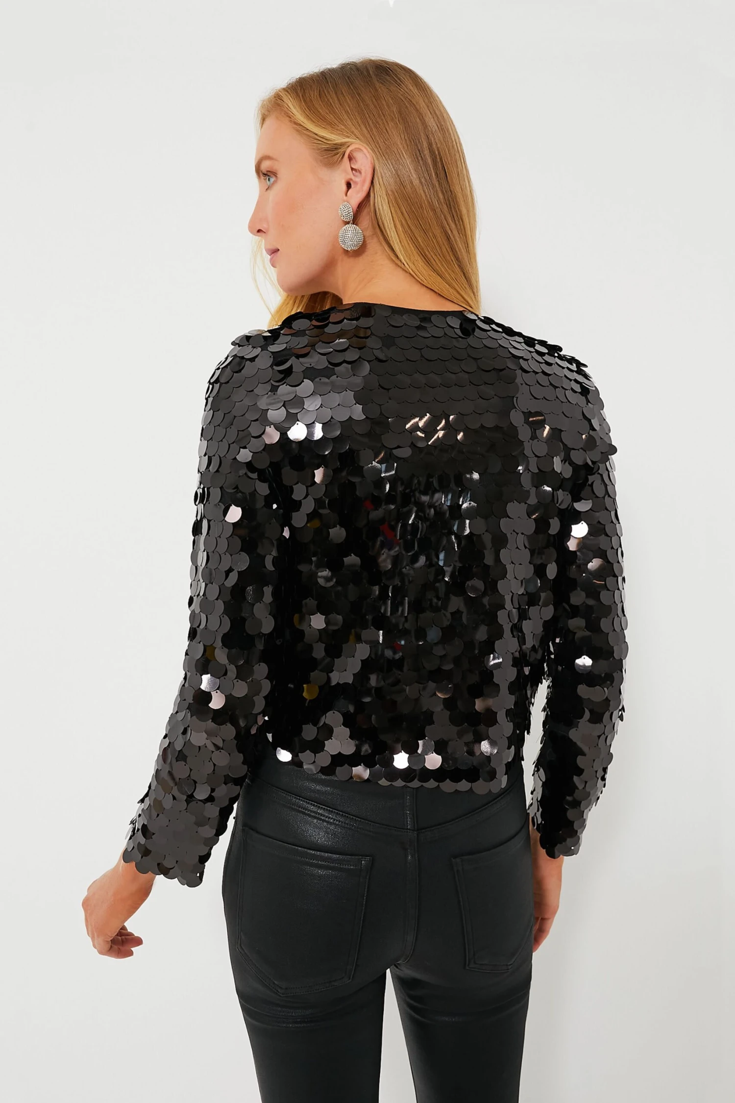 Take your moment to stand out in the Dazzle Jacket. This stunning slightly cropped silhouette features crewneck, long sleeves and black palliette sequins all over providing sparkling effect wherever you go! Perfect for a cocktail event or holiday party, this top is easy to accessorize. Pair with wide leg denim and heels for date night, or with a mini skirt and a clutch for an evening spent on the dance floor!
