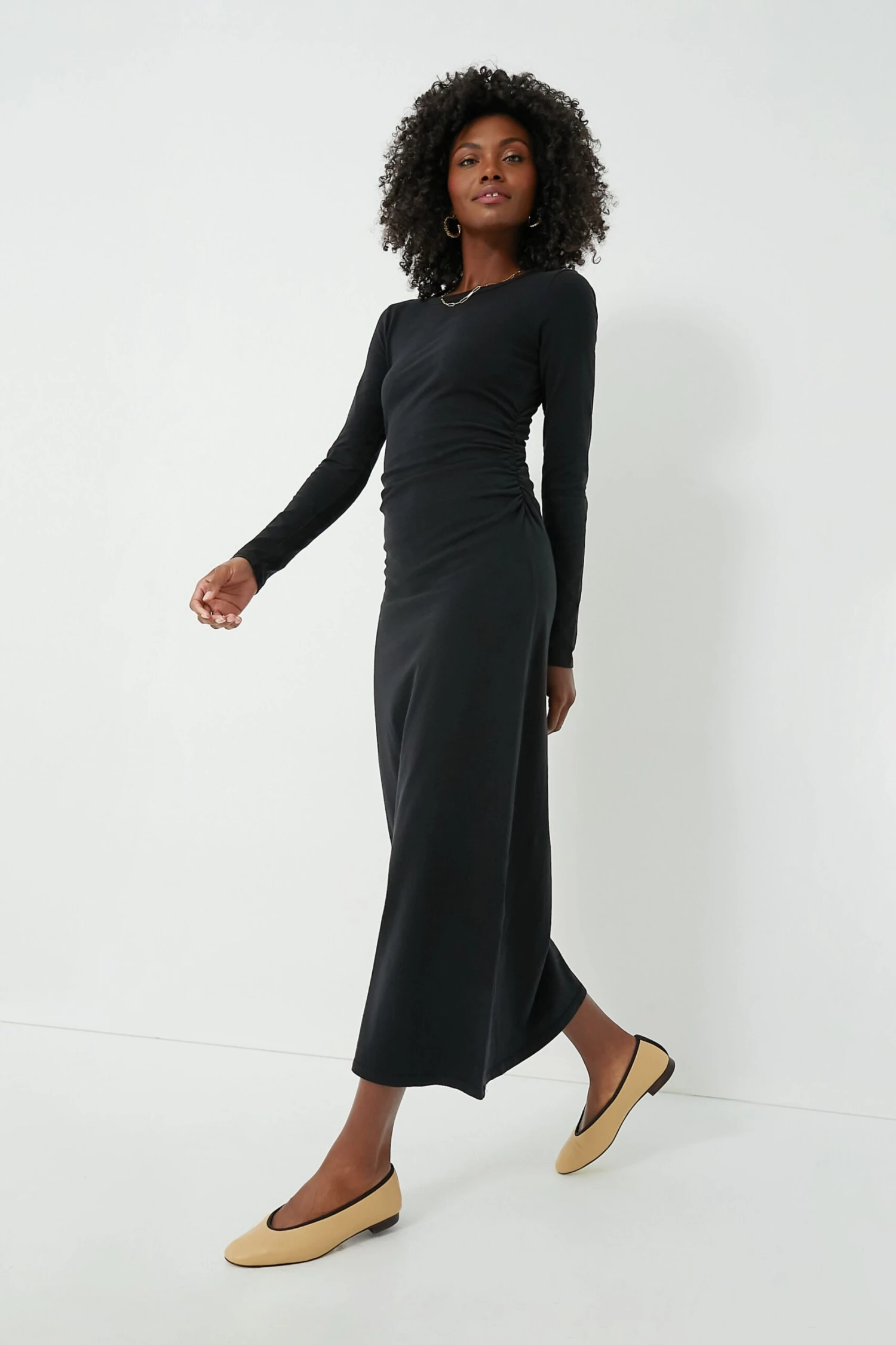 The Black Wiley Dress is a no-brainer! Beautifully crafted in a soft cotton jersey, this fitted maxi silhouette features a round neckline and an oh-so-flattering elastic ruched waist perfect for all shapes and sizes. We are styling this closet essential with boots and statement earrings for the easiest going-out look, or dressing it down with flats and a tote for an elevated everyday styling.Â
