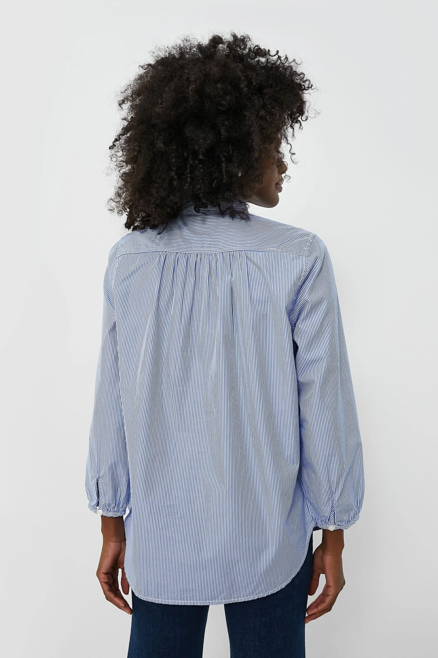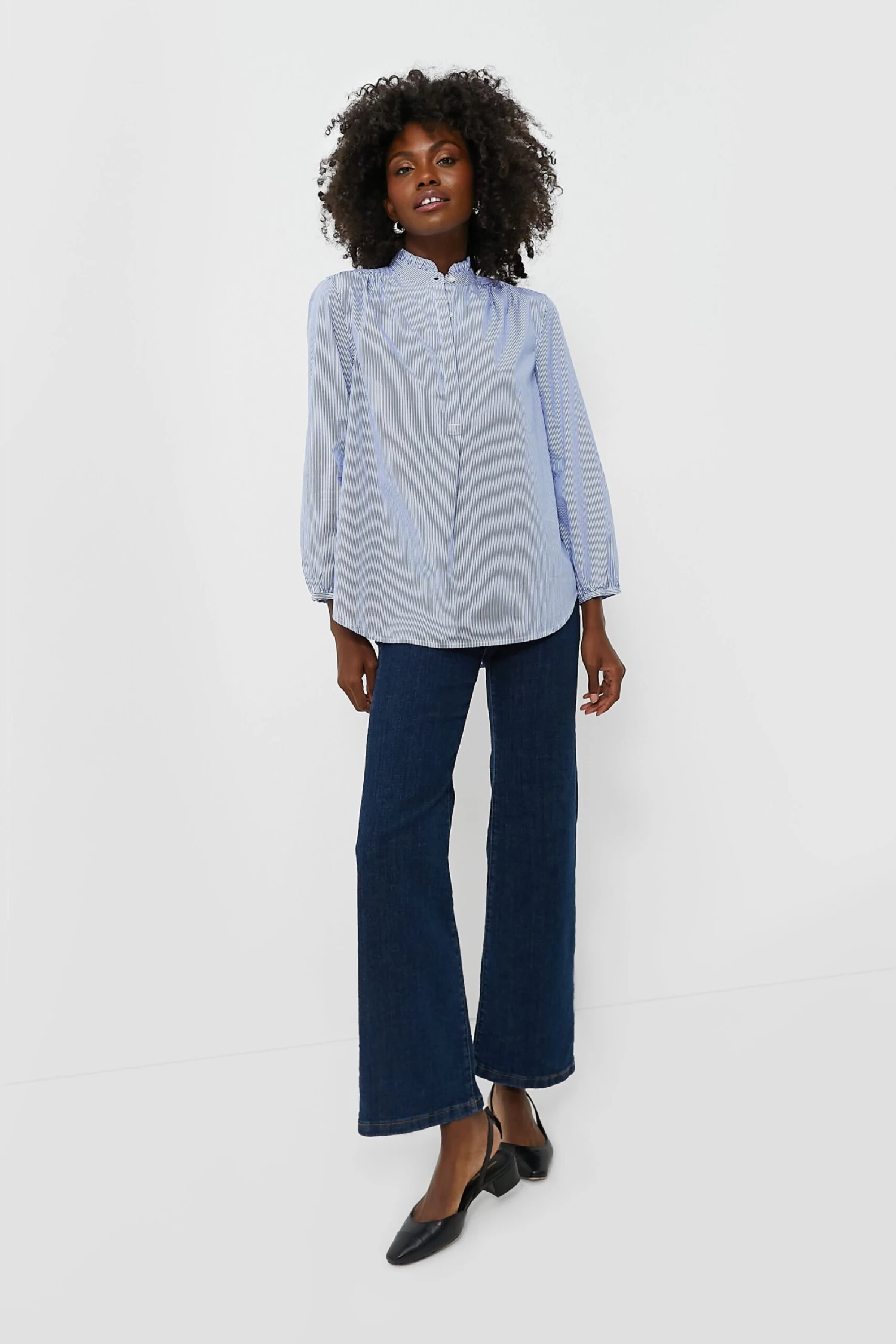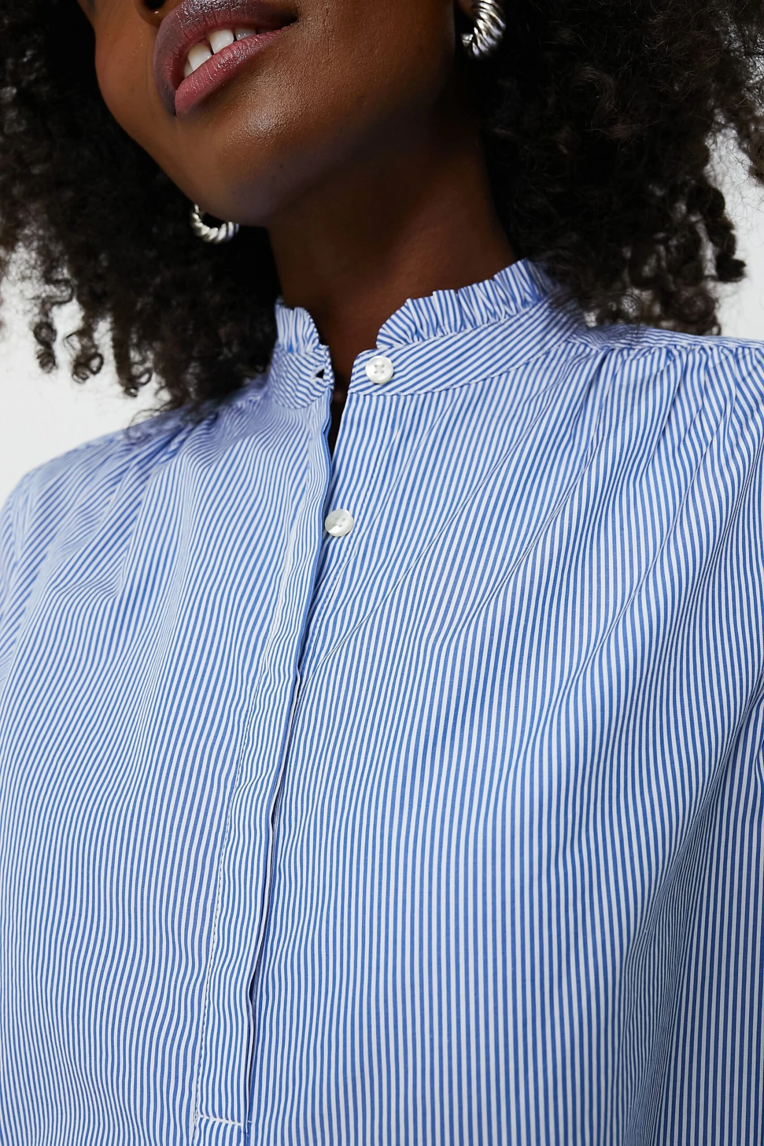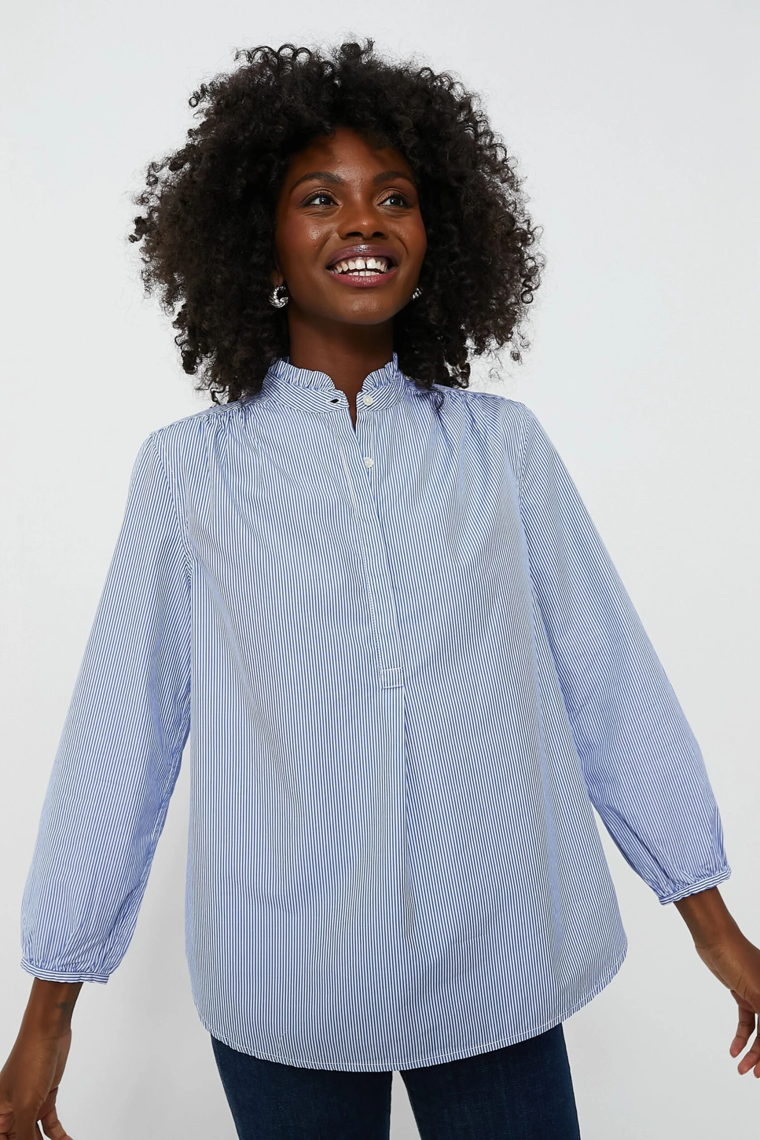 Effortless yet put-together, the Blue and White Stripe Sara B Henley is a twist on the classic button-down. Feminine and casual, this top features a standup ruffle collar and a hidden button placket. Pair with denim and flats for work or brunch with friends.