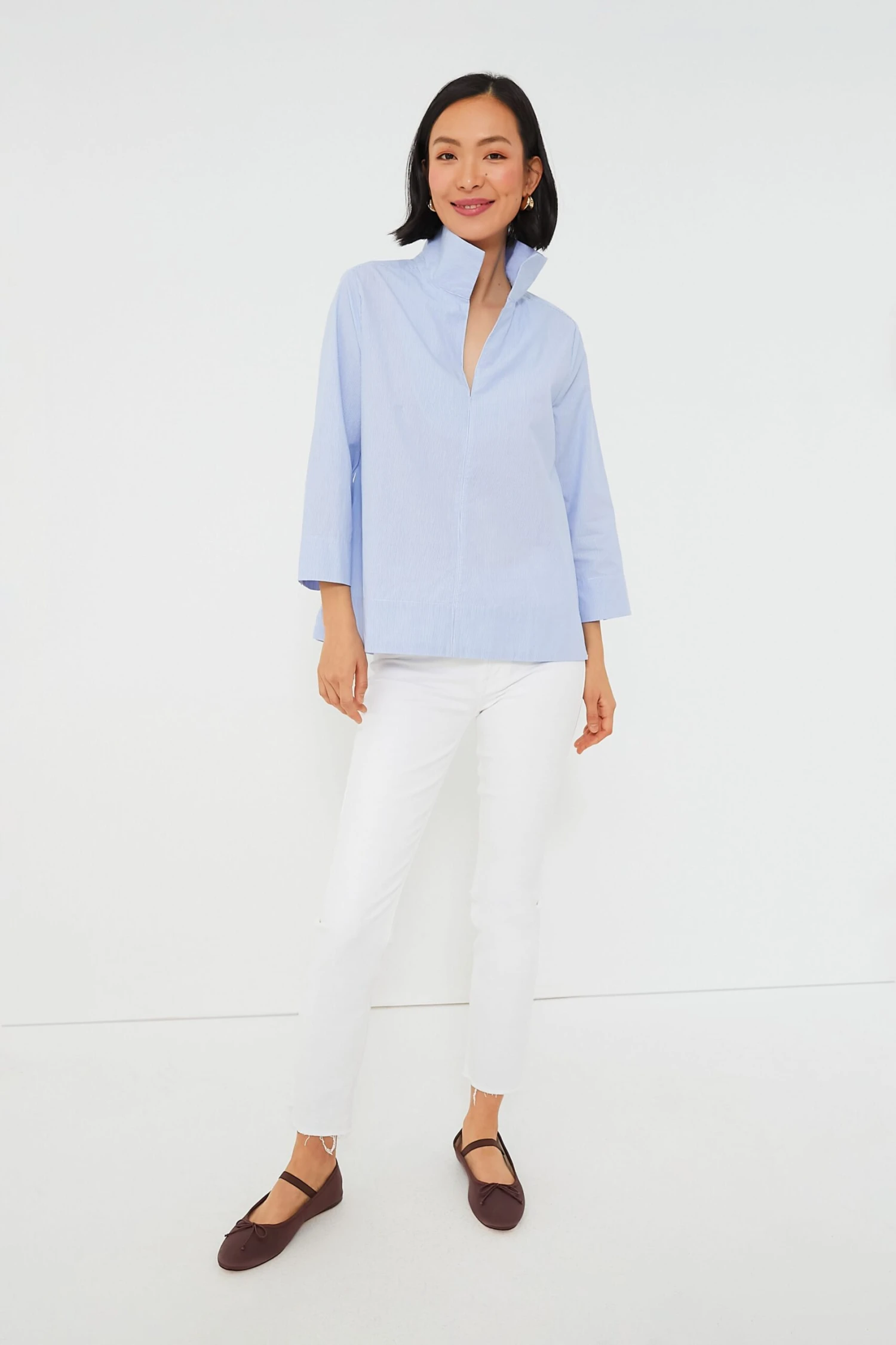 Your staple style gets a fresh update with the Sullivan Blouse. Made from a lightweight and crisp cotton material that provides effortless polish with a classic blue pinstripe print that pairs well with all kinds of neutrals, this stand collared shirt is a must-have in any closet. Style it with denim and sneakers for off-duty weekend wear, under a cardigan with boots when the temps drop, or with a sweet skirt and ballet flats for feminine flair.