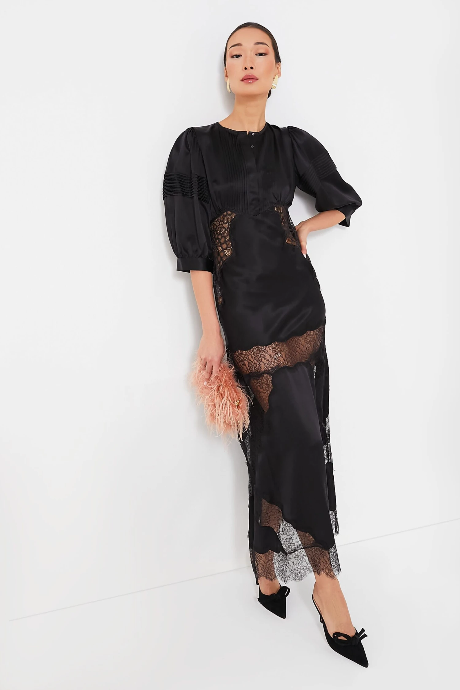 Ethereal and romantic, the Black Charmeuse Lace Bias Dress is an eye-catching midi perfect for date nights. Made from a smooth silk, this style boasts delicate pintuck details, billowy blouson sleeves, and intricate lace along the waistline, legs, and hem. Pair with heels and silver jewelry for an absolutely divine ensemble.