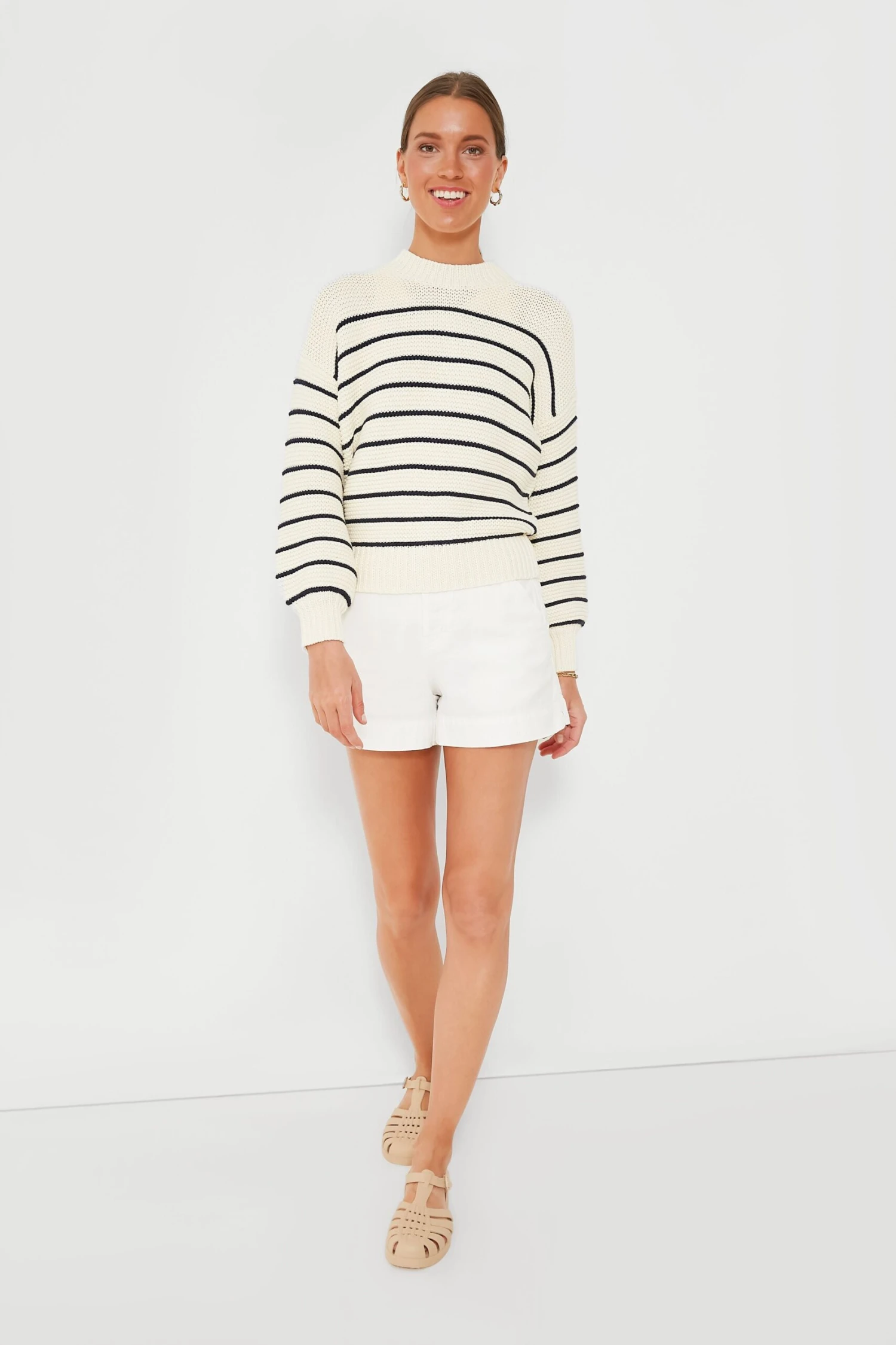 The Ivory and Dark Navy Stripe Button Back Sweater is one of our very favorite knit pieces this season. A unique silhouette that can be worn two ways– as a chic crewneck with buttons down the back, or with them in the front as a classic cardigan– this style has gorgeous details that you are sure to love. Style this with any color of denim and a pair of sneakers for a minimal, cool-girl look– or add as many accessories as you like, we love it with a silk scarf!