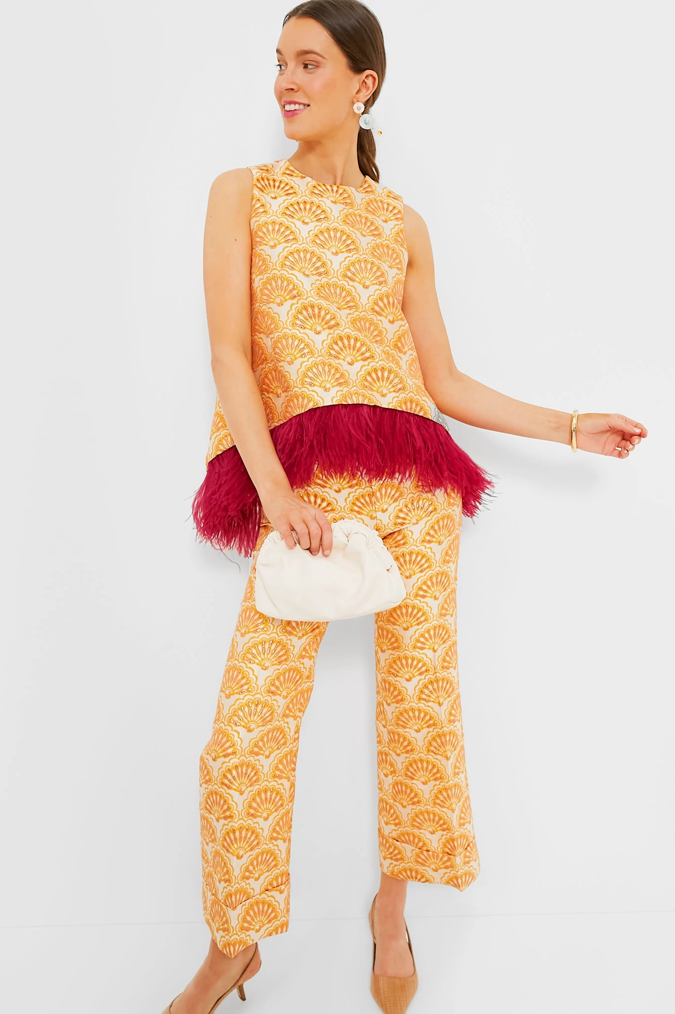 The Fans Hendrix Pants are made for party princesses. In a stunningly textured jacquard fabric, these chic bottoms feature a flattering high rise, hip pockets for added functionality, and a subtle flare at the ankles. The combination of sleek silhouette and bright color is a look we cannot get enough of! Style with the matching Jacquard Fans La Scala Top for a statement look that is sure to turn heads, or pair with a crisp white blouse for a slightly more muted look.