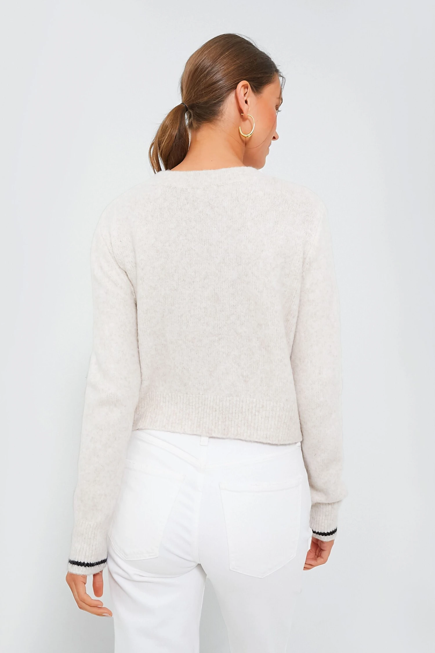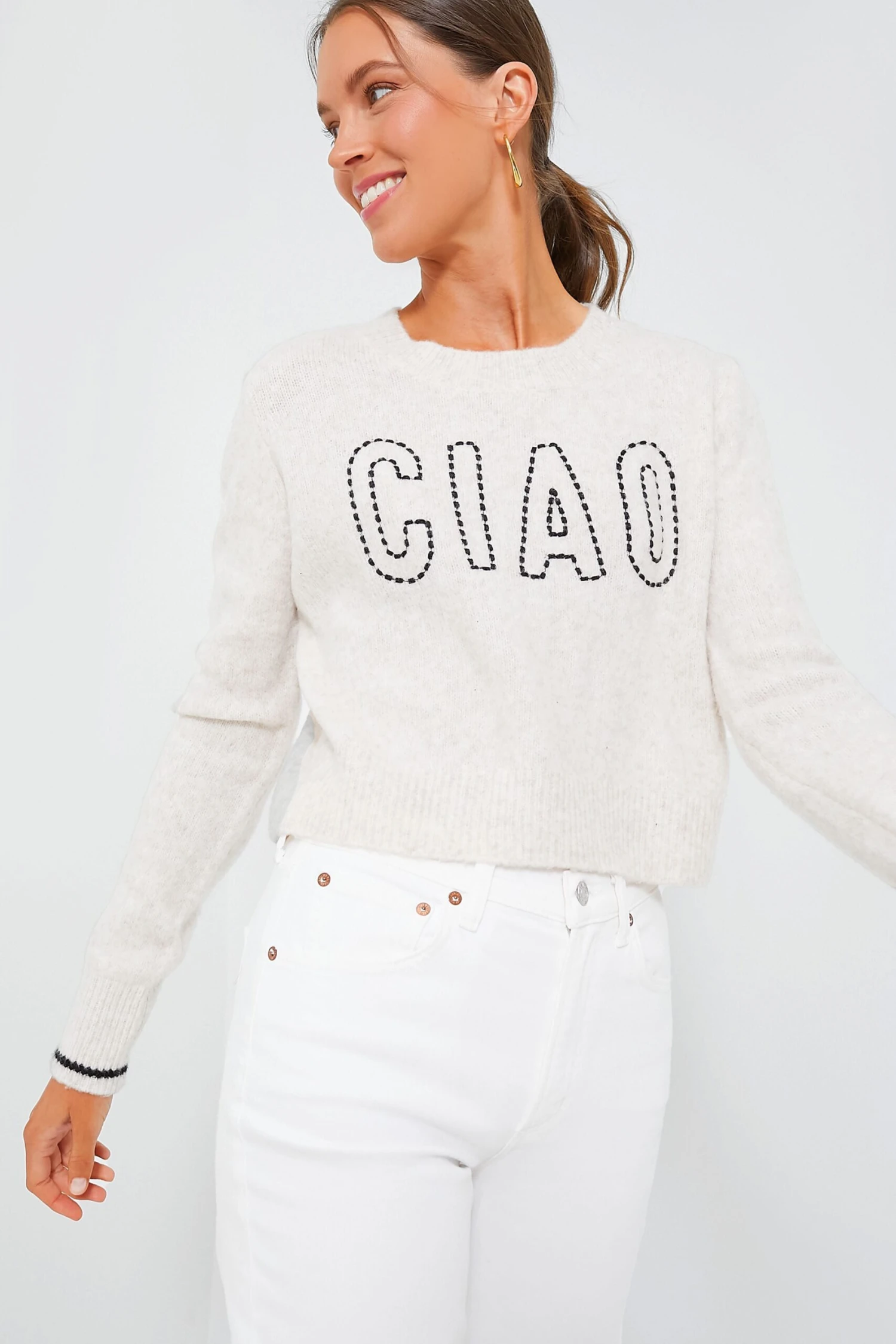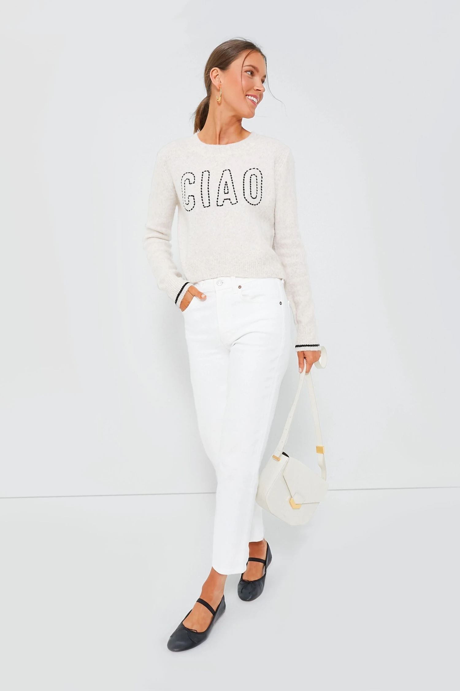 Made from super-soft yarn, the Light Oatmeal Milan Sweater is sure to make a statement. Featuring chain stitch lettering of our favorite Italian greeting, ribbed cuffs with a contrast stripe, and a slightly relaxed fit that is ultra-cozy, you’ll want to wear this knit nonstop. Pair with denim and booties for an effortless daytime look, then swap them out for leather leggings and gold hoops for an extra bit of fun.