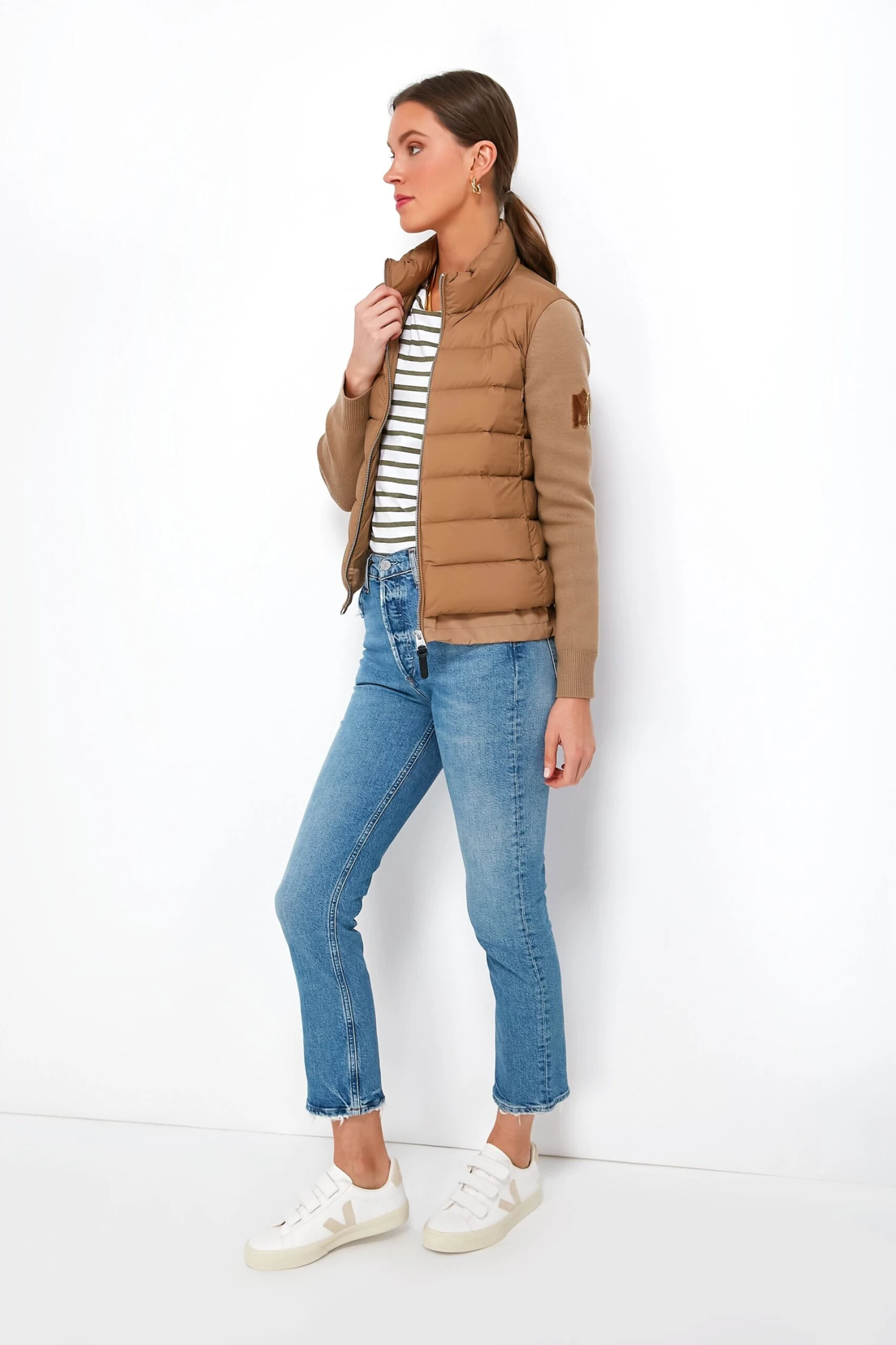 The Dark Camel Oceane-Z Jacket is a mixed-media cardigan that combines the warmth of a full down coat with the coziness of soft knit sleeves. A transitional style with a relaxed fit, this coat flaunts a recycled quilt shell, stand collar, and invisible side pockets for functional and chic additions. Perfect for those days when you’re not sure where the weather will take you, we are pairing this with every and anything from denim to sweats for all day comfort.