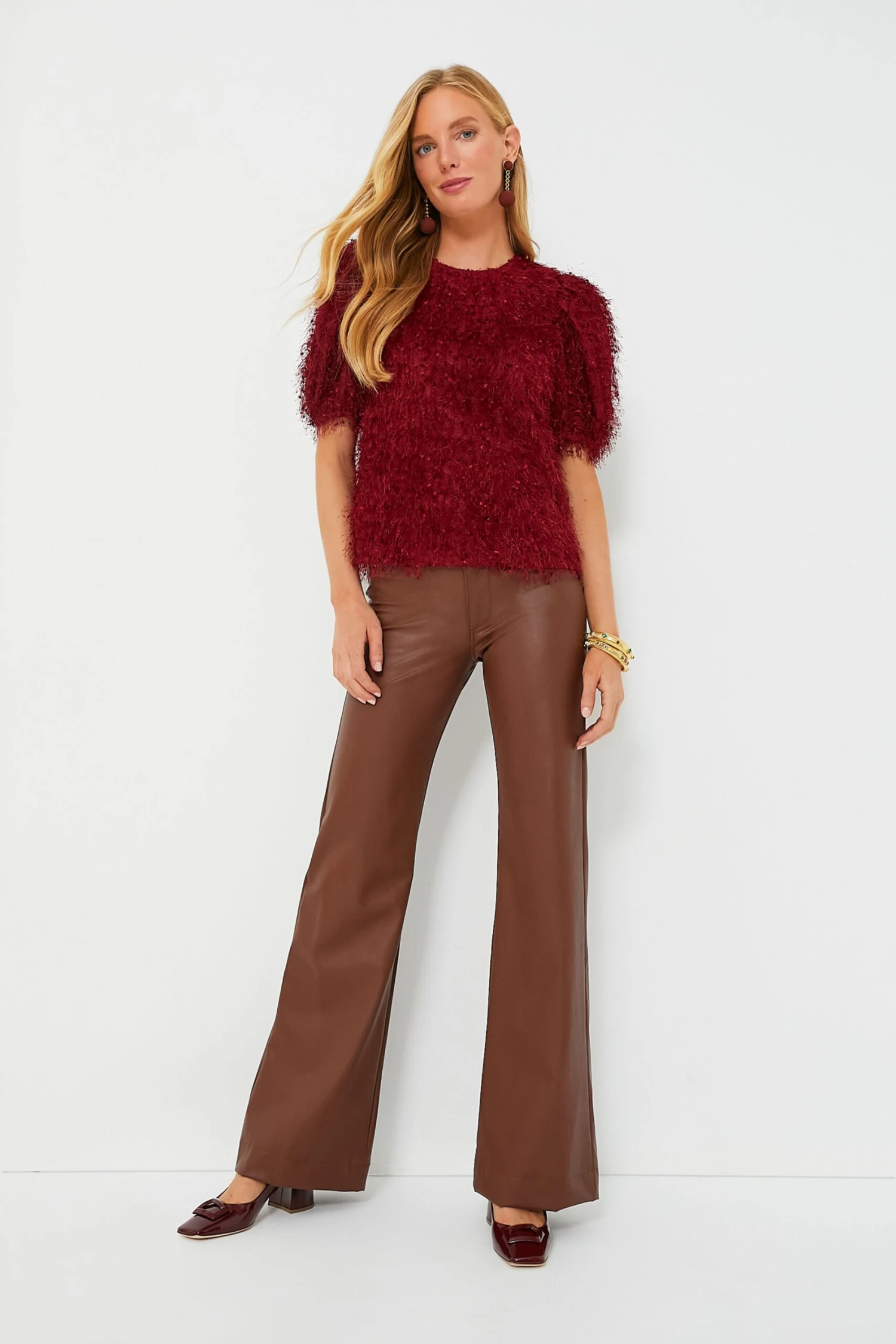 Make a chic statement in the Merlot Hope Blouse. The classic silhouette is upgraded with a textured fabric and deep, rich hue. This top can be the star of the show on its own or styled with fun accessories to create a whimsical and eccentric look. We are pairing this with a black maxi skirt and gold earrings for an elegant dinner party.Â