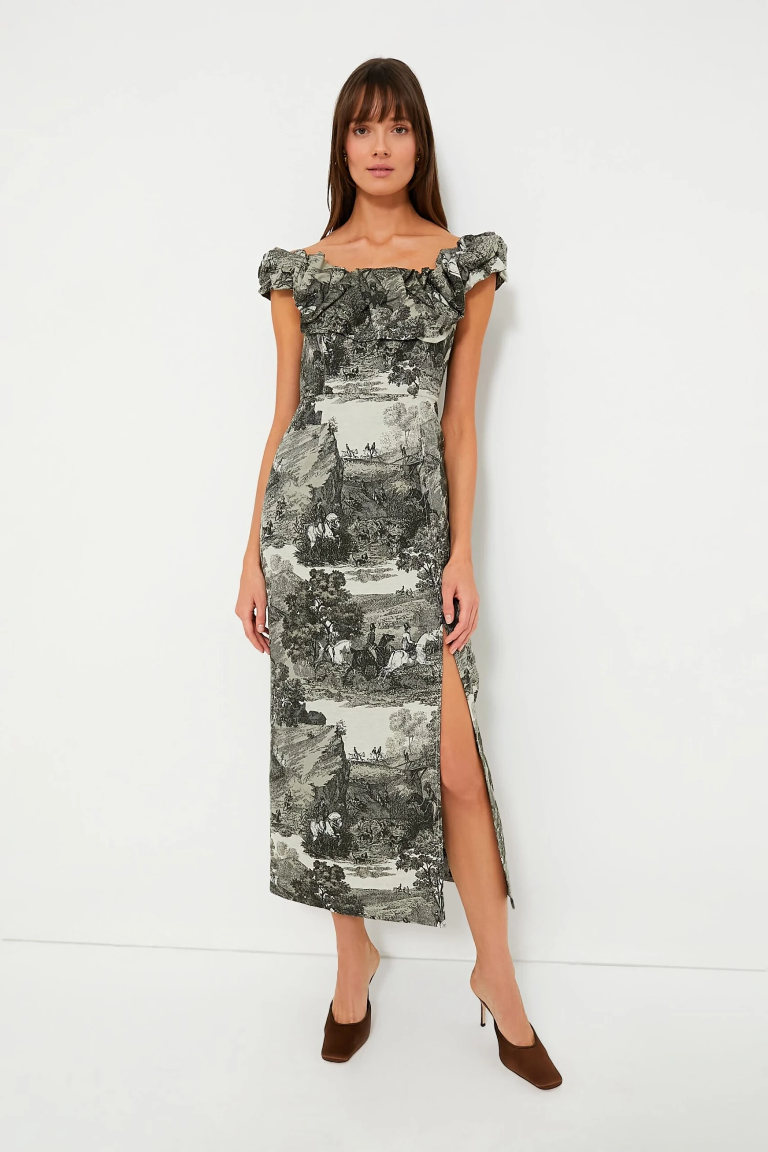 The Middleburg Toile Suze Dress is an exquisite style that is perfect for elevated occasions. With an off-the-shoulder neckline with magnificently textured gathering, a slim column silhouette, and a Victorian-inspired fabric, this look is graceful and elegant while still being modern. Pair with heels and a gold necklace or simple ballet flats for a feminine look that will be the belle of the ball.