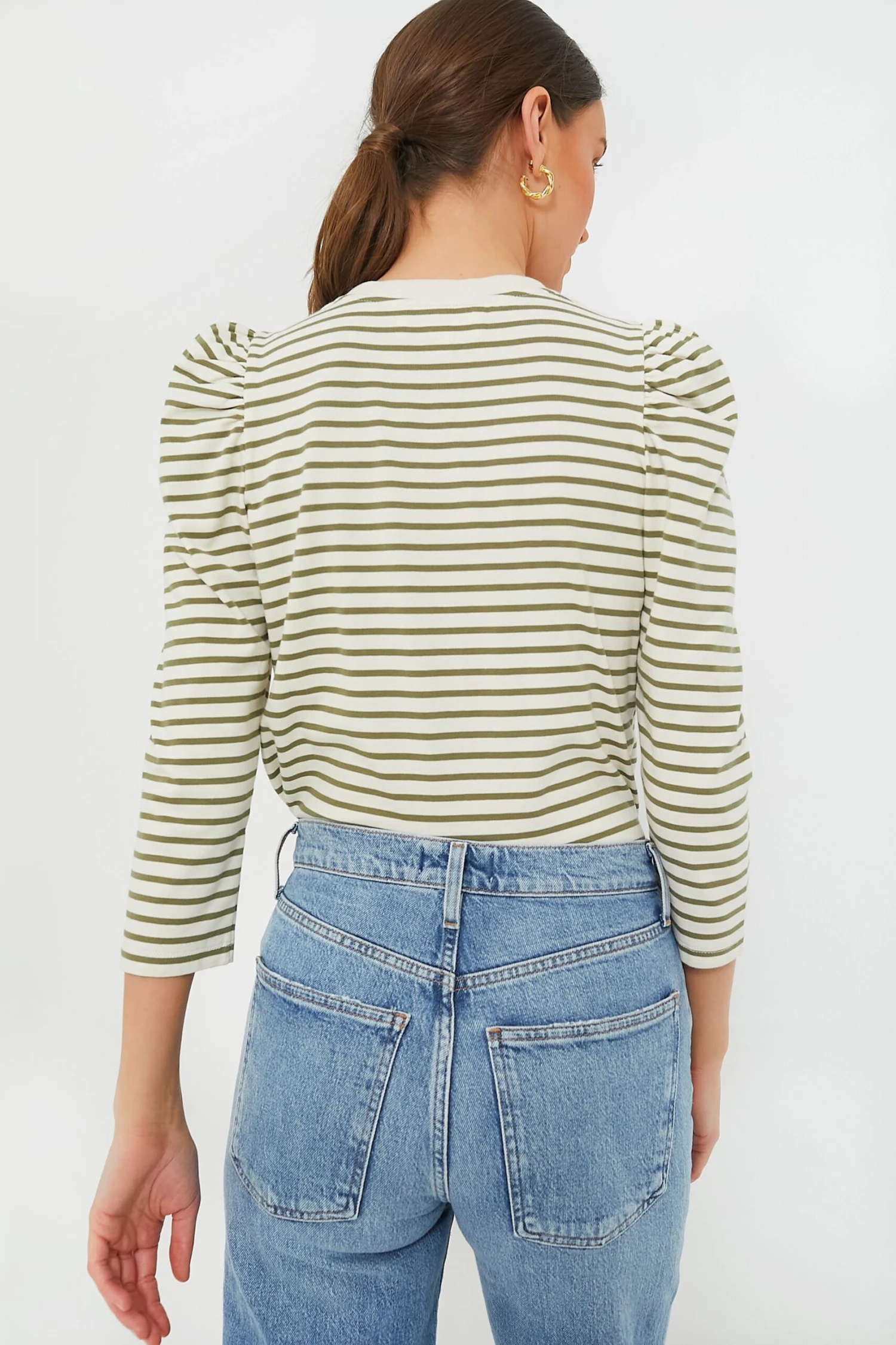The Olive Striped Vesty Long Sleeve Crewneck will instantly become one of your everyday essential go-to styles. Featuring a classic crewneck fit with a twist, this style adds the perfect flair with slightly puffed shoulders and three-quarter length sleeves. Pair with denim and gold jewelry for an easy cool-girl look all year long.