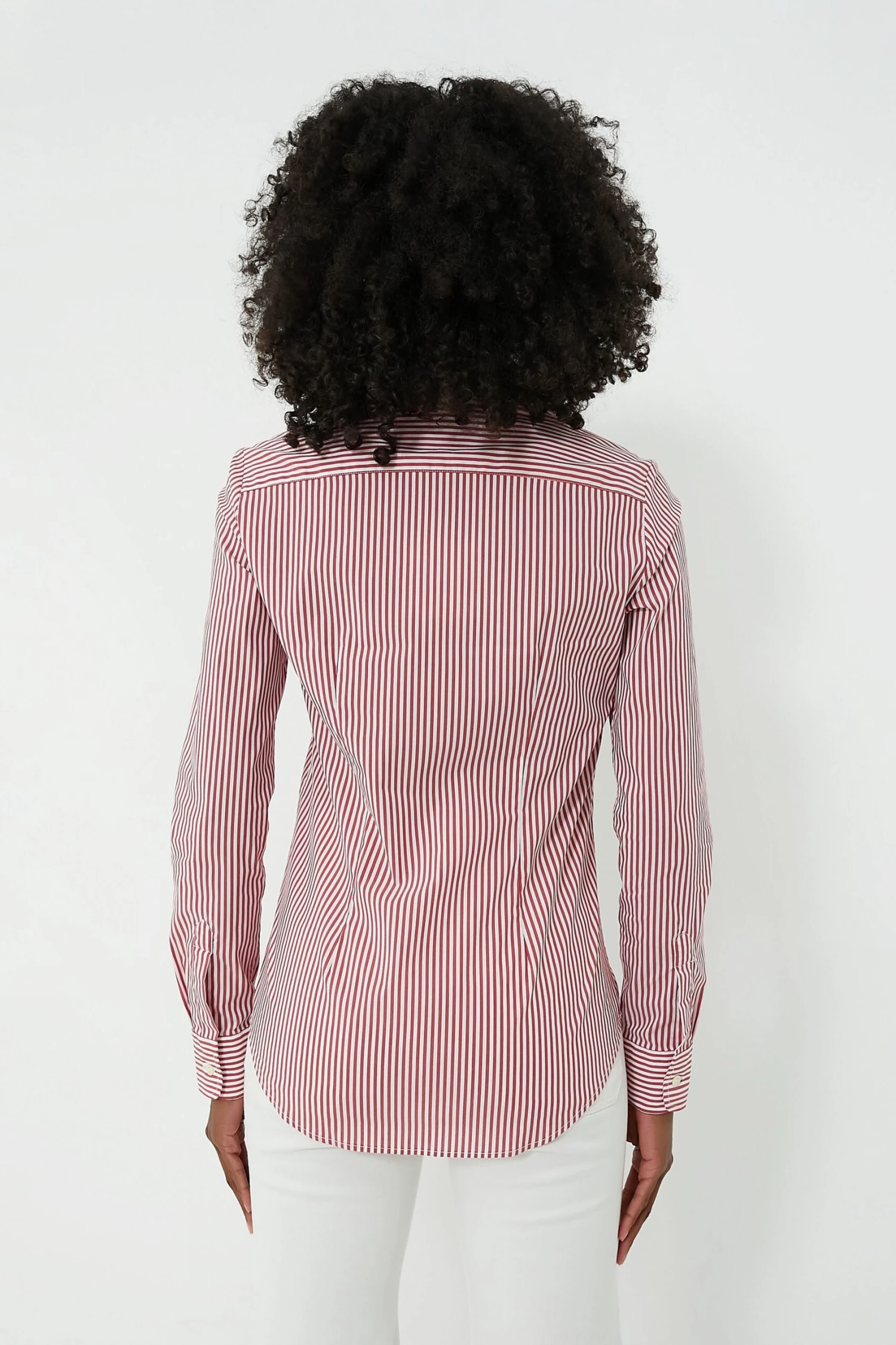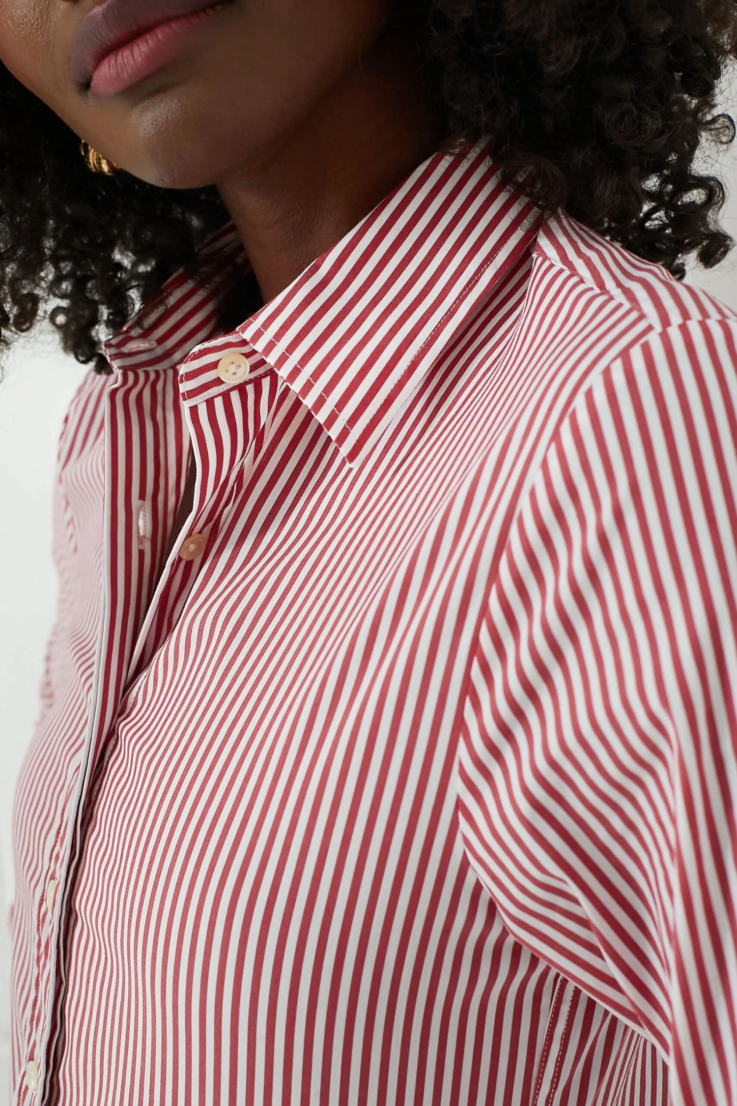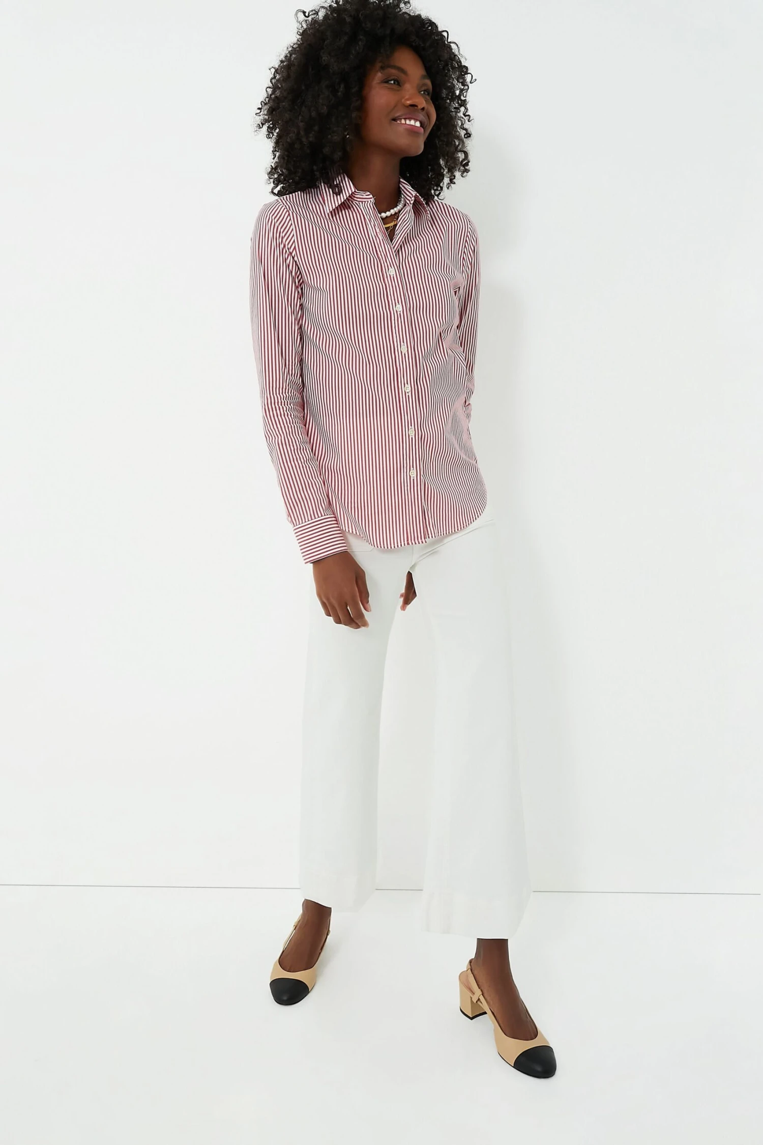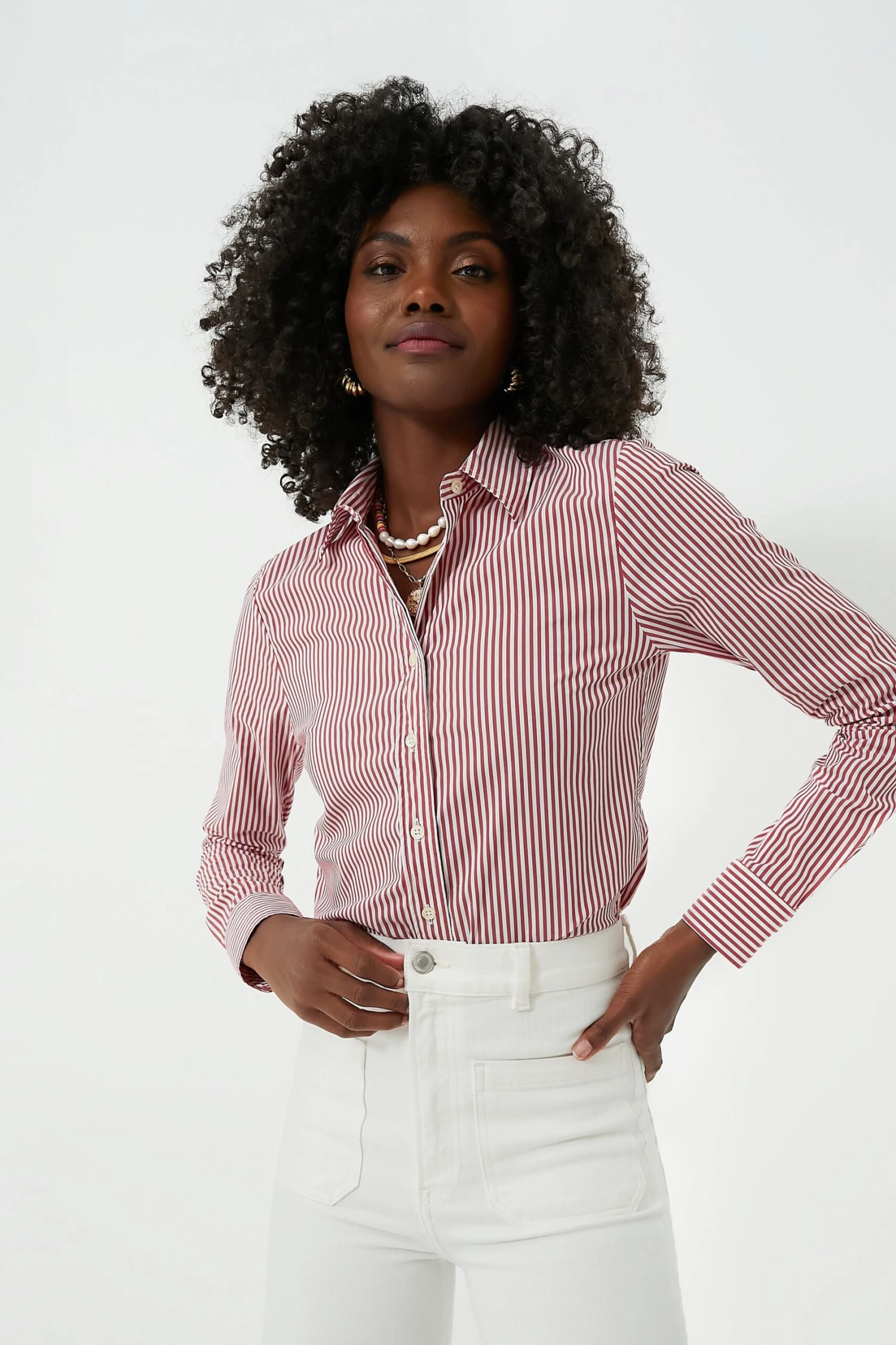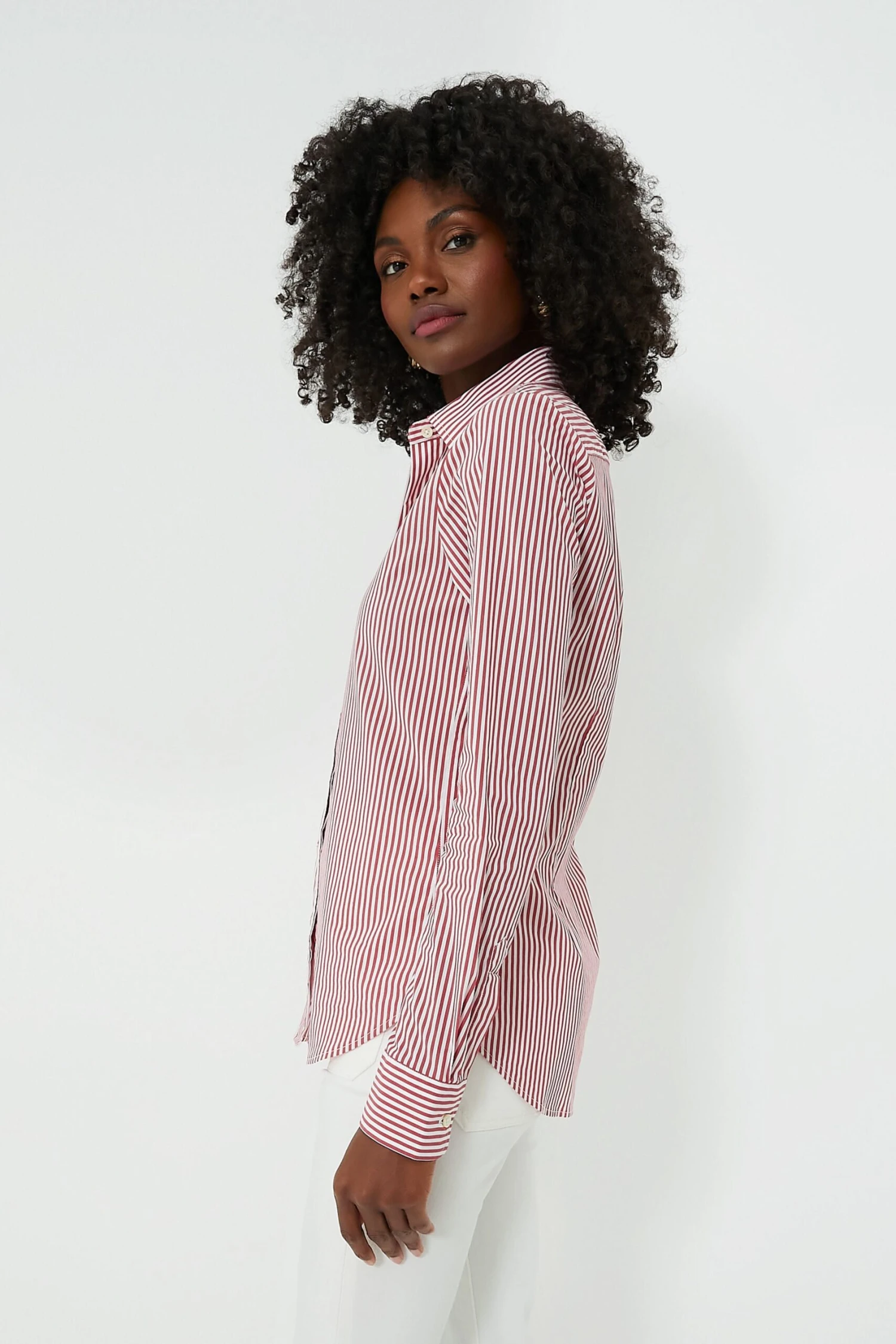 Say goodbye to blouse gaps and safety pins. The Red and White Stripe Icon Shirt features hidden buttons that reinforce the shirt where you need it most. The placket will lay flat (finally!) across the bust for a clean and polished look you can feel great about. Versatile and stylish, this blouse is long enough to tuck in, yet short enough to leave out, and perfect for year-round layering!