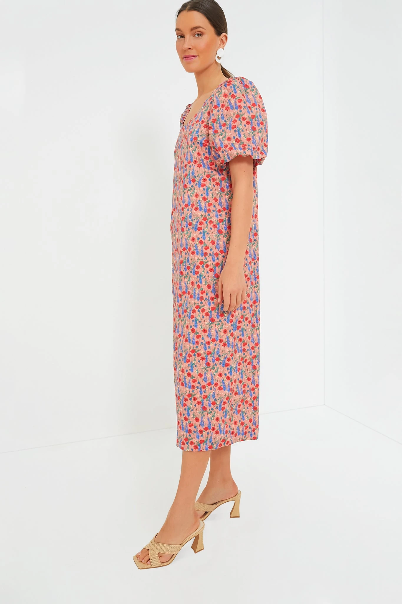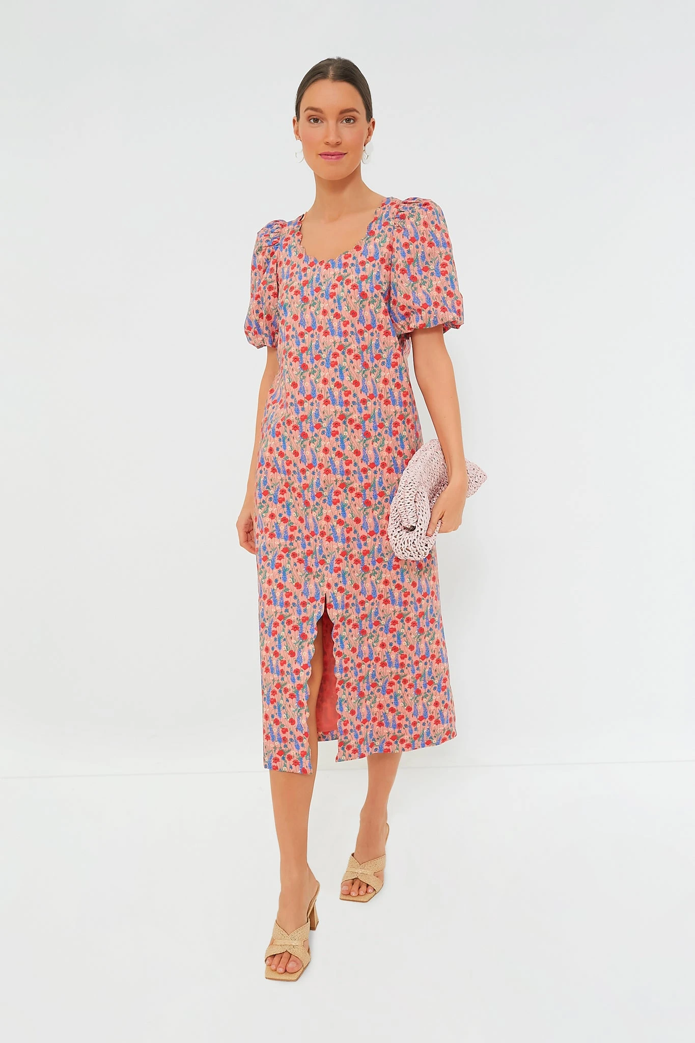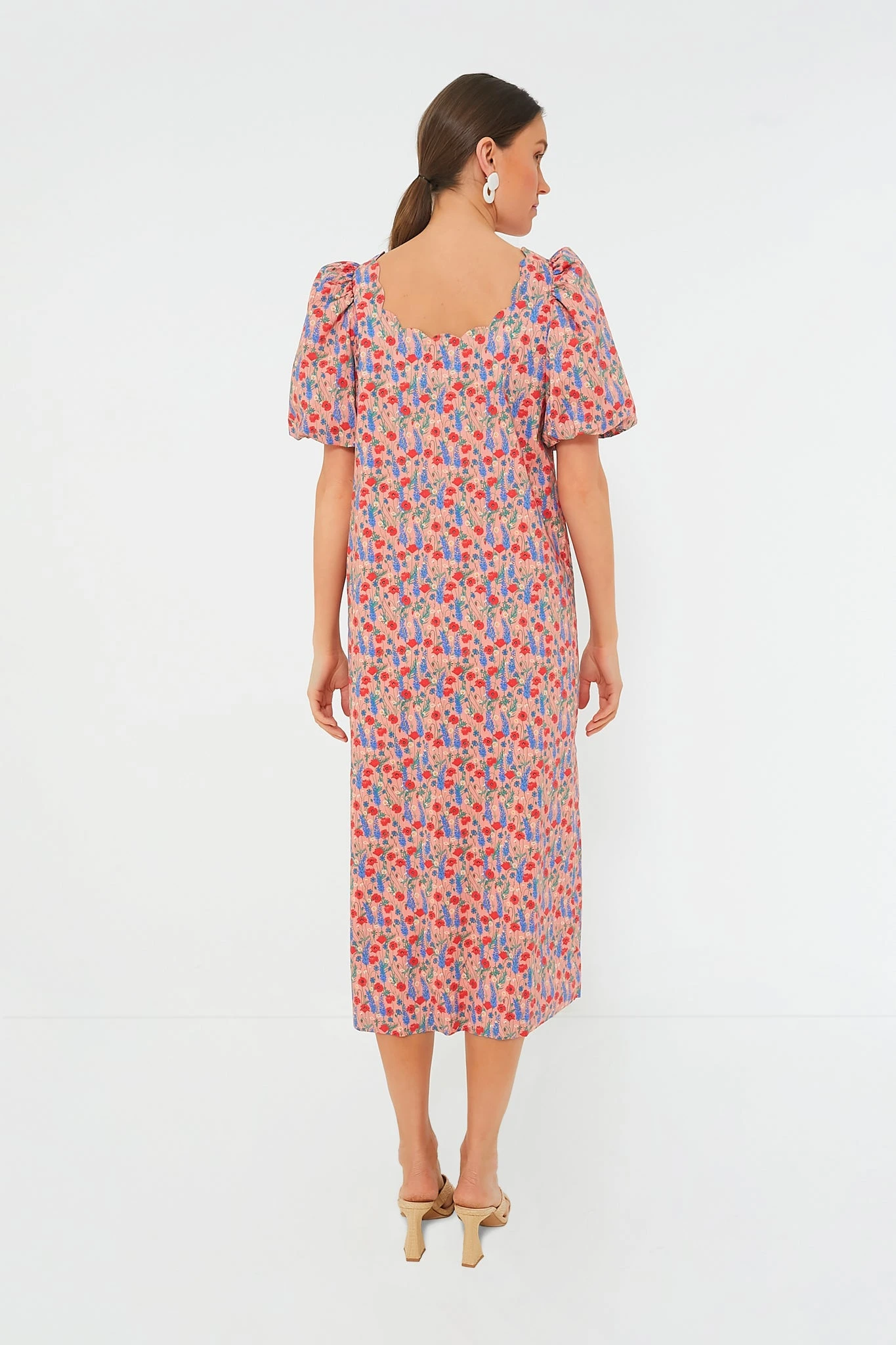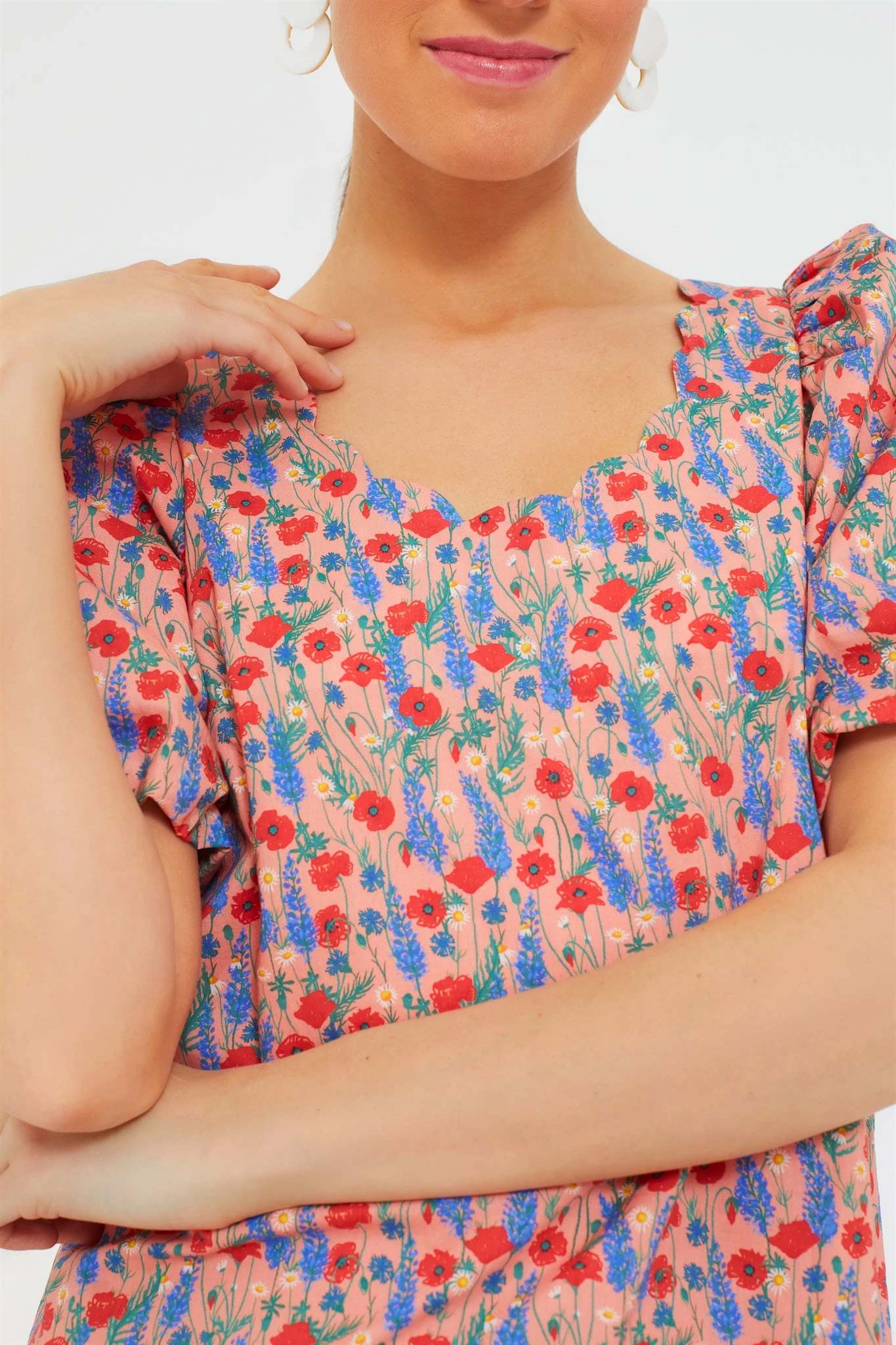 Filled with floral femininity, the Red Poppy Floral Scalloped Serena Midi Dress has a straight silhouette with a scalloped neckline, short puff sleeves, and a scalloped slit detail. Pair with heels and pearls for a bridal luncheon or with ballet flats and gold hoops for work.