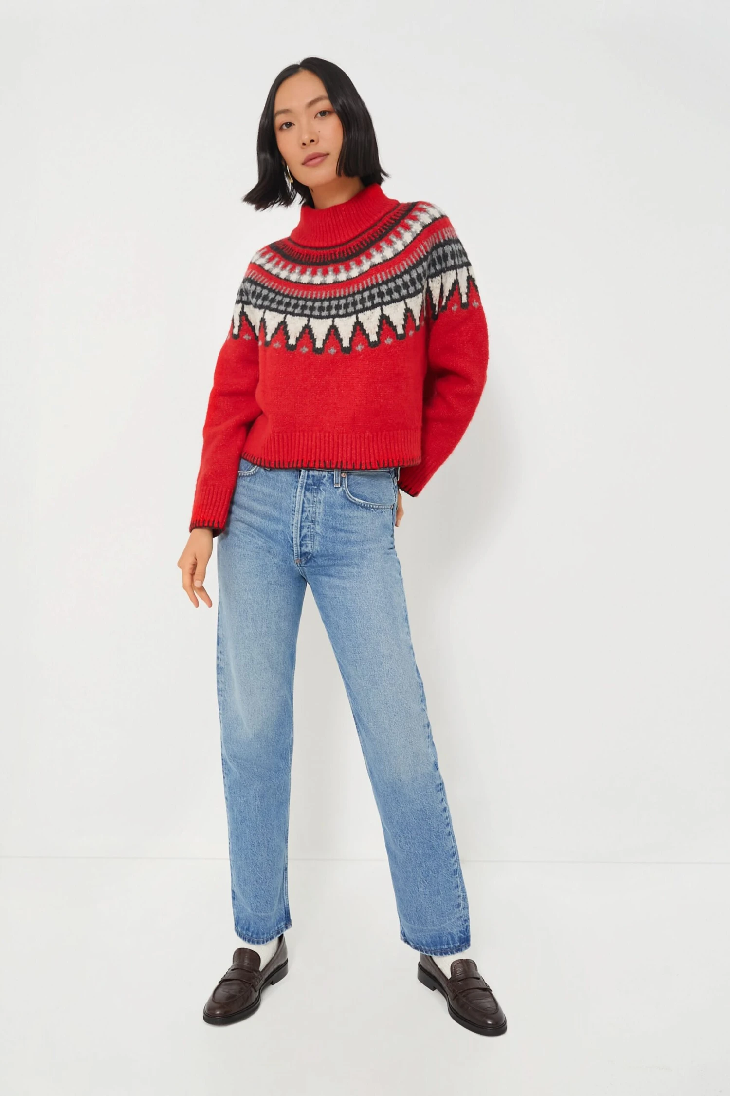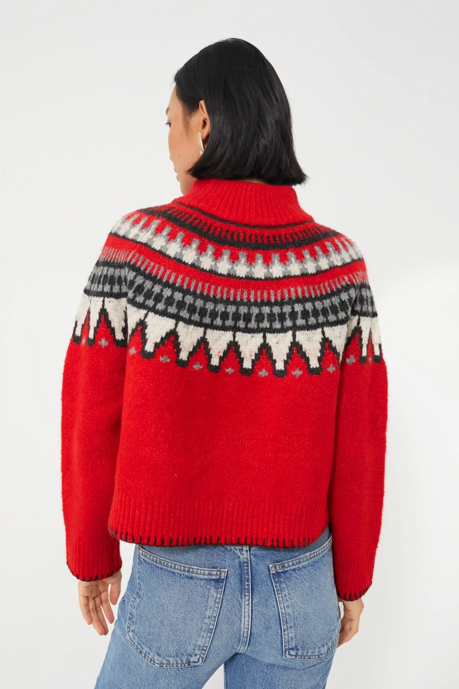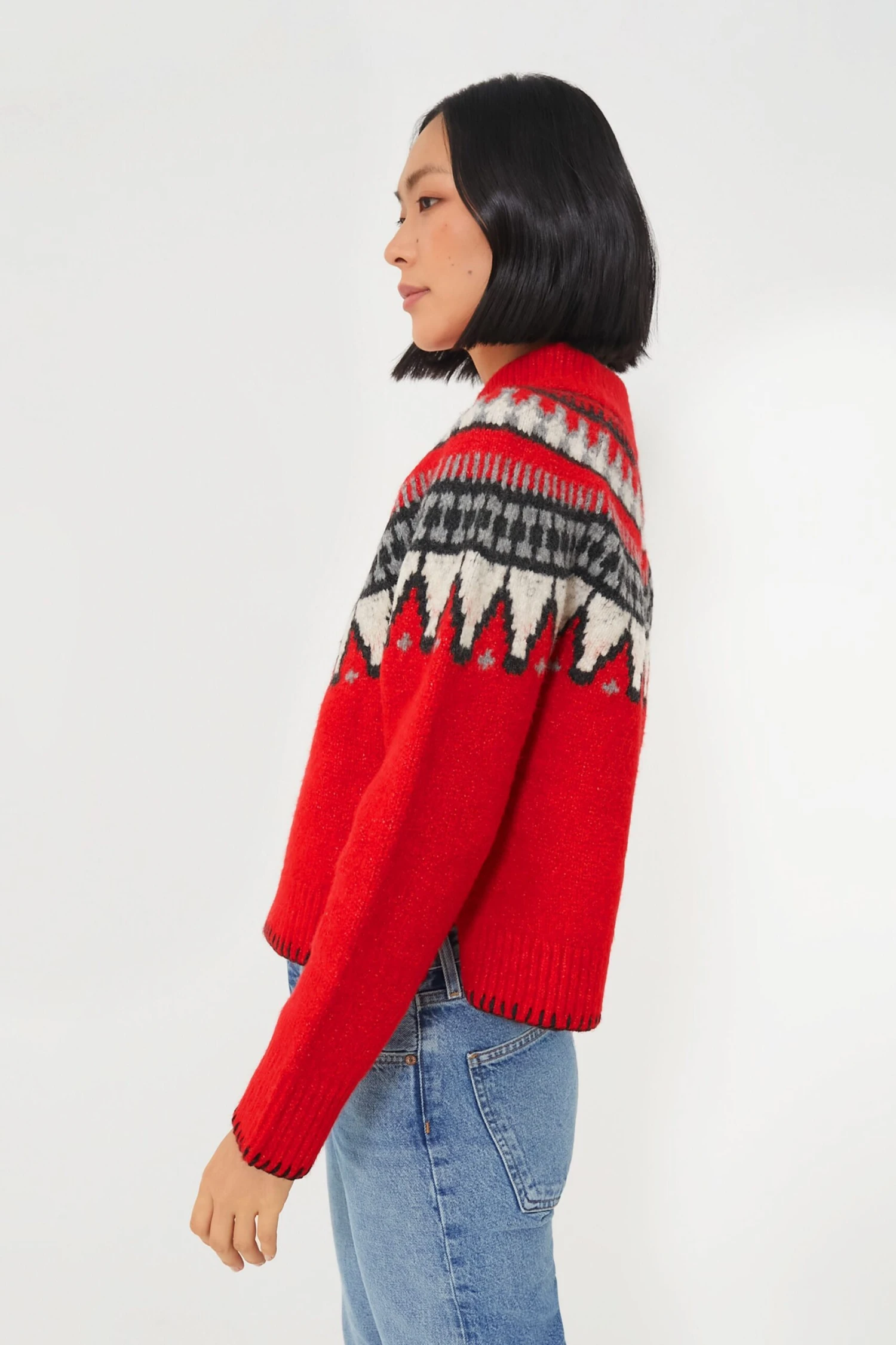 The Ruby Ceylona Sweater is the ultimate knit style for curling up by the fire with a good book and a cup of hot cocoa. The vibrant red and bold Fair Isle design create a cozy, striking silhouette. Versatile as ever, we are styling this with leggings and leather boots for a morning coffee run, or with denim and chelsea boots for après-ski dinner and drinks.