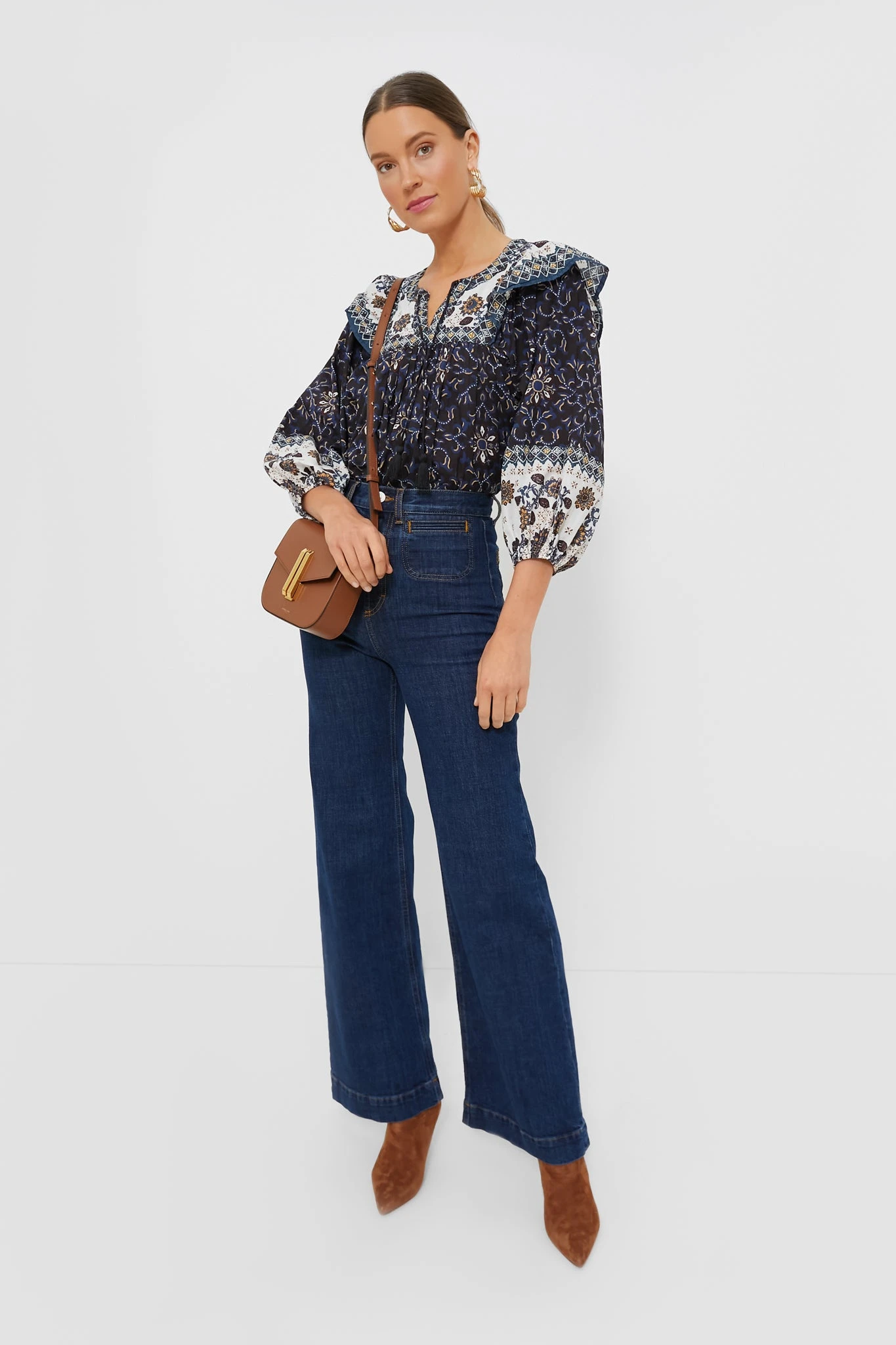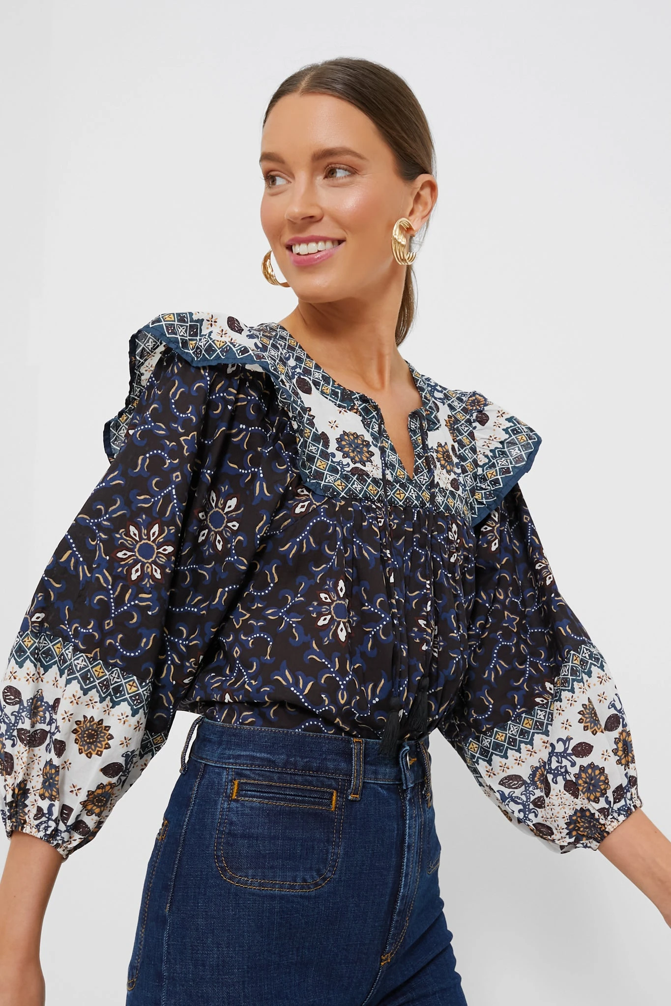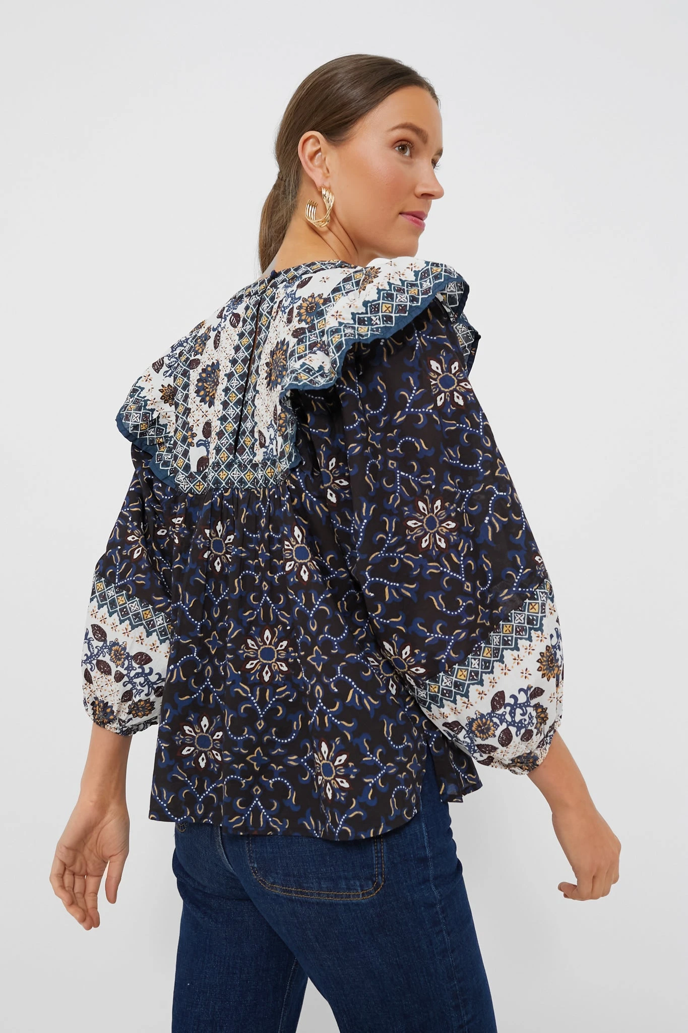 Brighten up your day and add a touch of charm to your outfit with the Sabina Lina Blouse. Crafted from certified organic cotton mulmul, this top features a folk-inspired print, beautifully placed yoke, ruffles, and sleeve hem, exuding a unique and artistic flair. The rouleau tie at the neck offers a personalized touch to your style. It is perfect to pair with your favorite jeans or skirt, making it an ideal choice for those days that need a little extra burst of creativity.