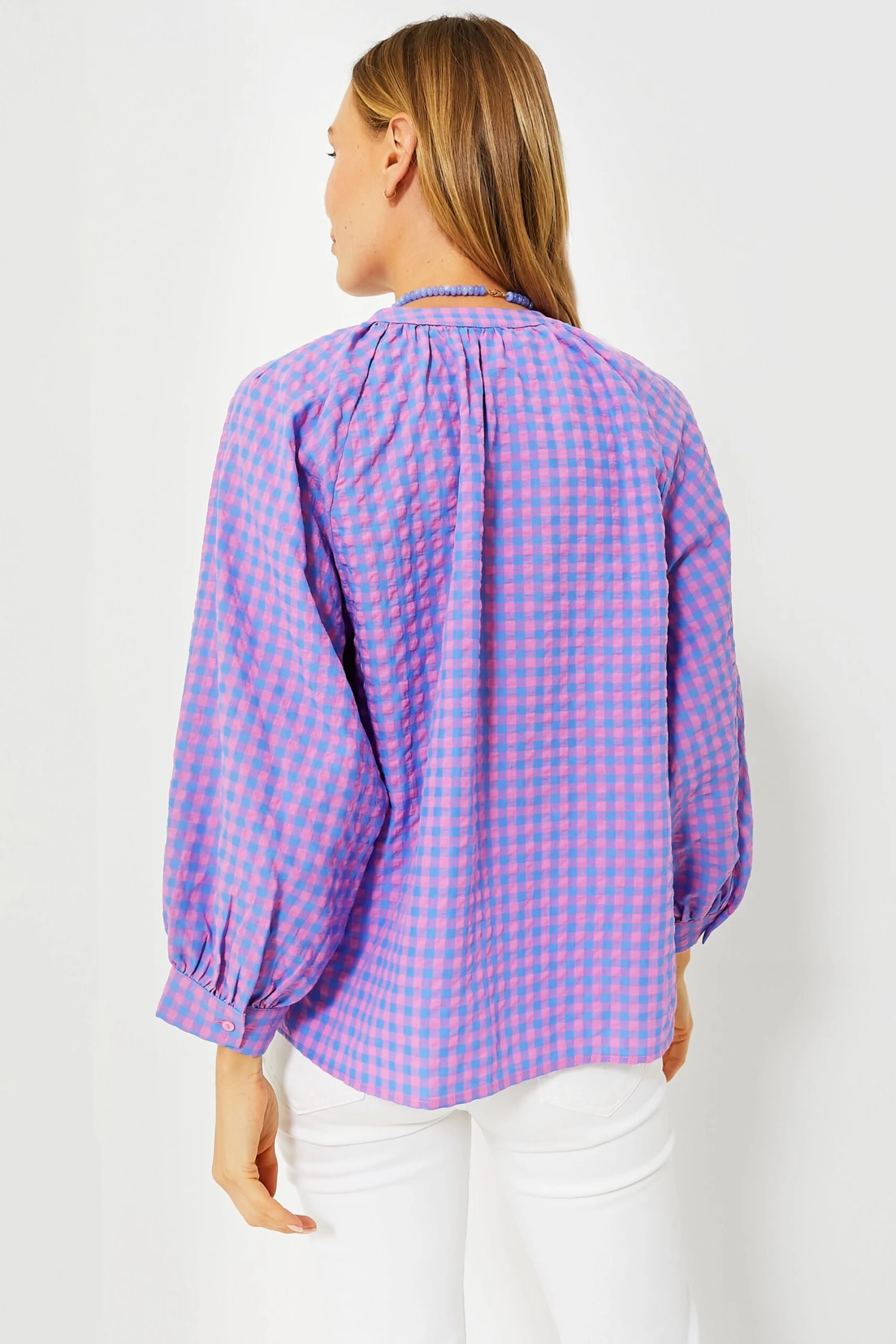 The Rosie Blouse is full of surprises! Designed with an unexpected pink and blue gingham print done in a slightly crinkled, textured fabric, this top is equally playful as it is flirty. Opt for white denim and strappy sandals for everything from Sunday brunch to backyard get-togethers.Â