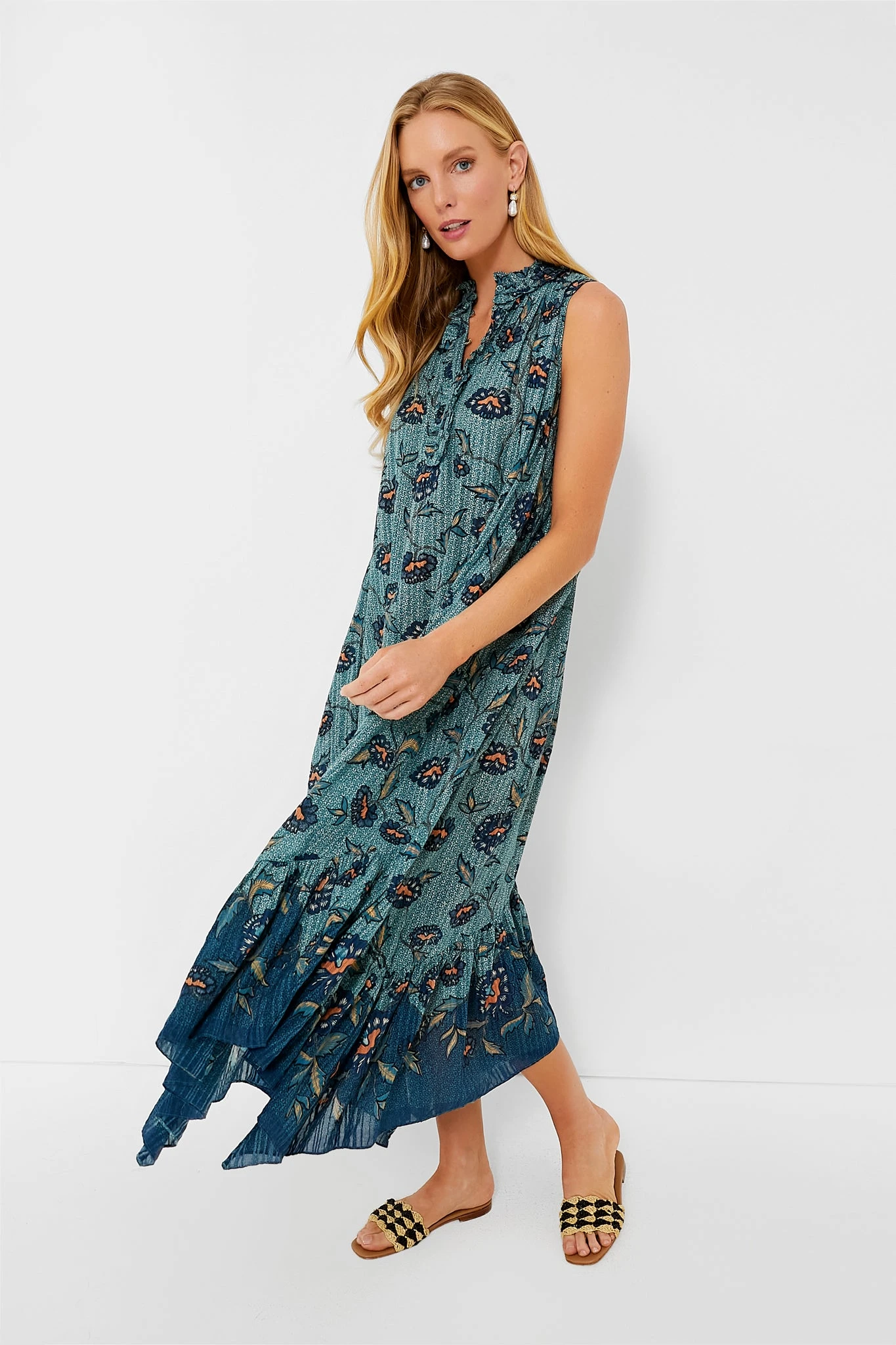 The Beverly Dress is made from Ulla Johnson’s shadow stripe cotton-viscose blend that’s patterned with whimsical botanicals displayed in shades of blue. Traced with subtle ruffles, this sleeveless dress floats down to a midi silhouette that you can temper with a belt and has an effortless handkerchief hem for a touch of drama. Style with espadrilles and a tote for a casual look, or dress it up with heels and gold earrings.Â