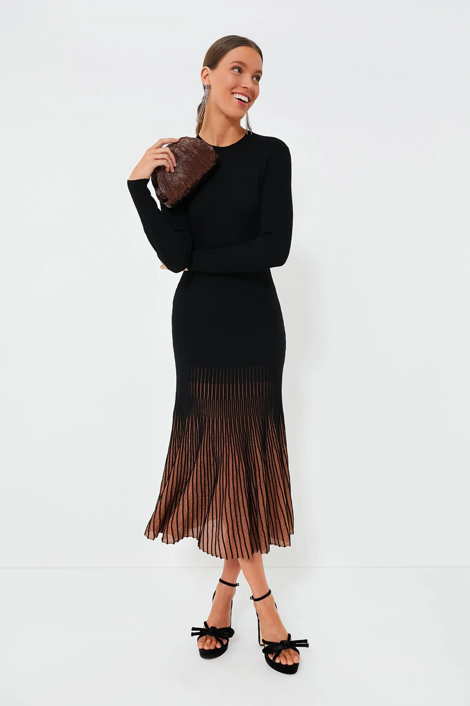 Defined by languid and elegant volumes, the Gild Magnolia Dress is crafted from an ultrafine sunburst knit in timeless black noir. This long-sleeve dress has a round neckline and unfurls to a midi-length hem that explodes with shimmering bronze hues. Pair with black heels and gold jewelry for your next formal event or dinner party.