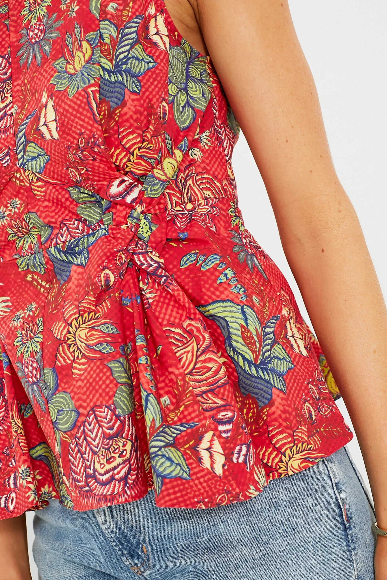 The Sydney Top is a sculptural silhouette crafted from cotton poplin with a red base and is richly decorated with hand-painted botanicals inspired by a vintage tapestry. This sleeveless top features a cinched waist and an elegantly flared hem. Pair with denim and sneakers for an elevated everyday look, or dress up with a skirt and ballet flats!