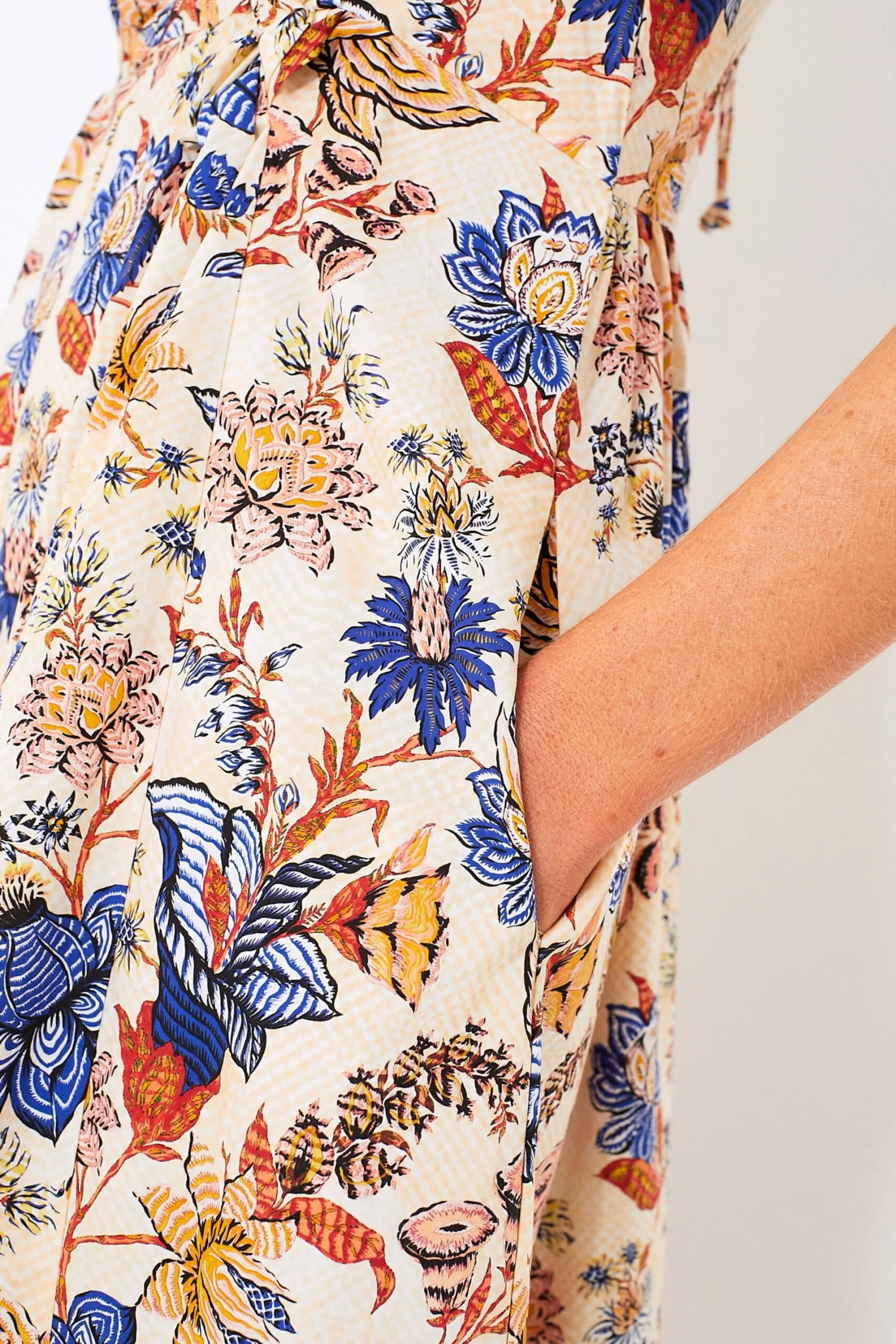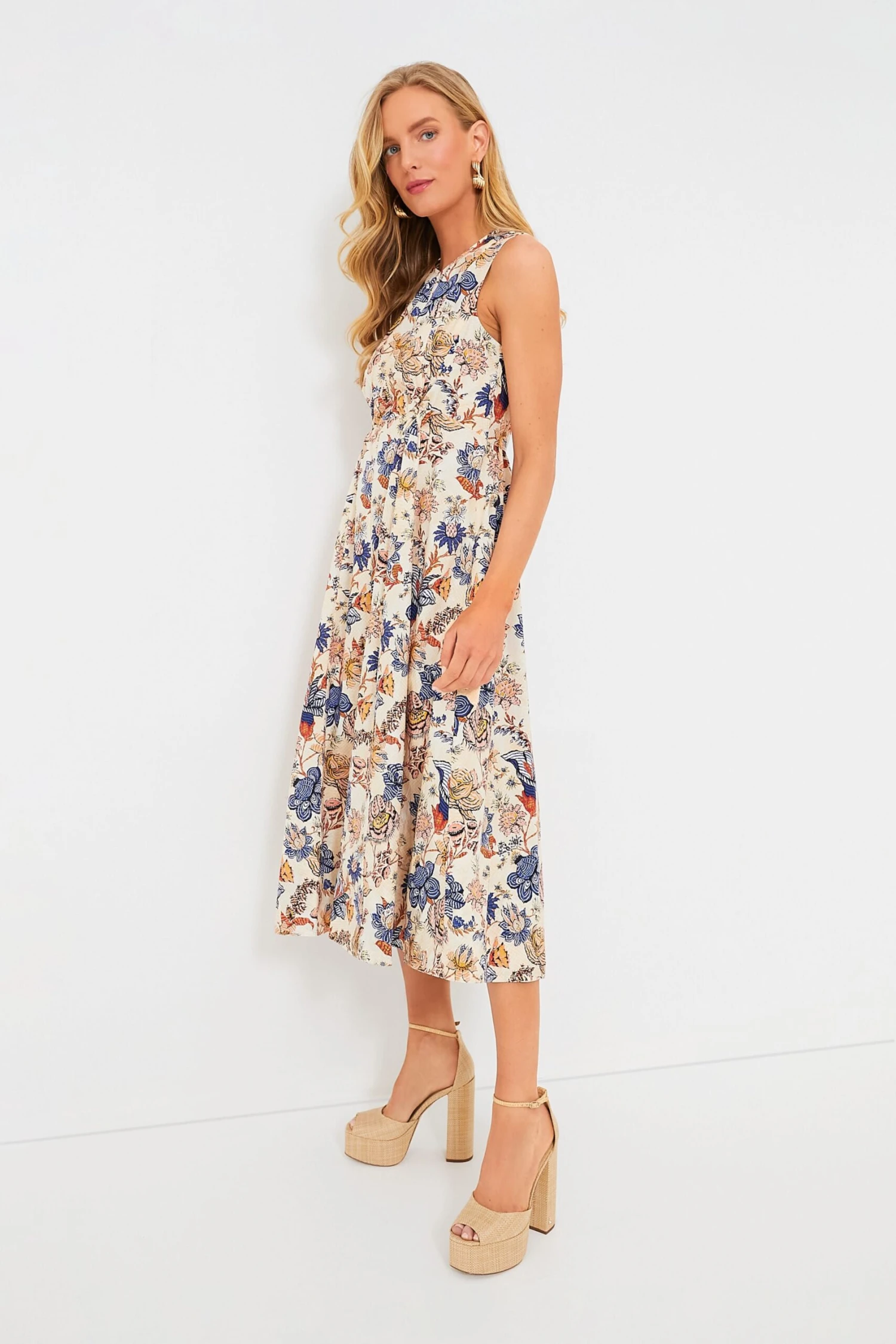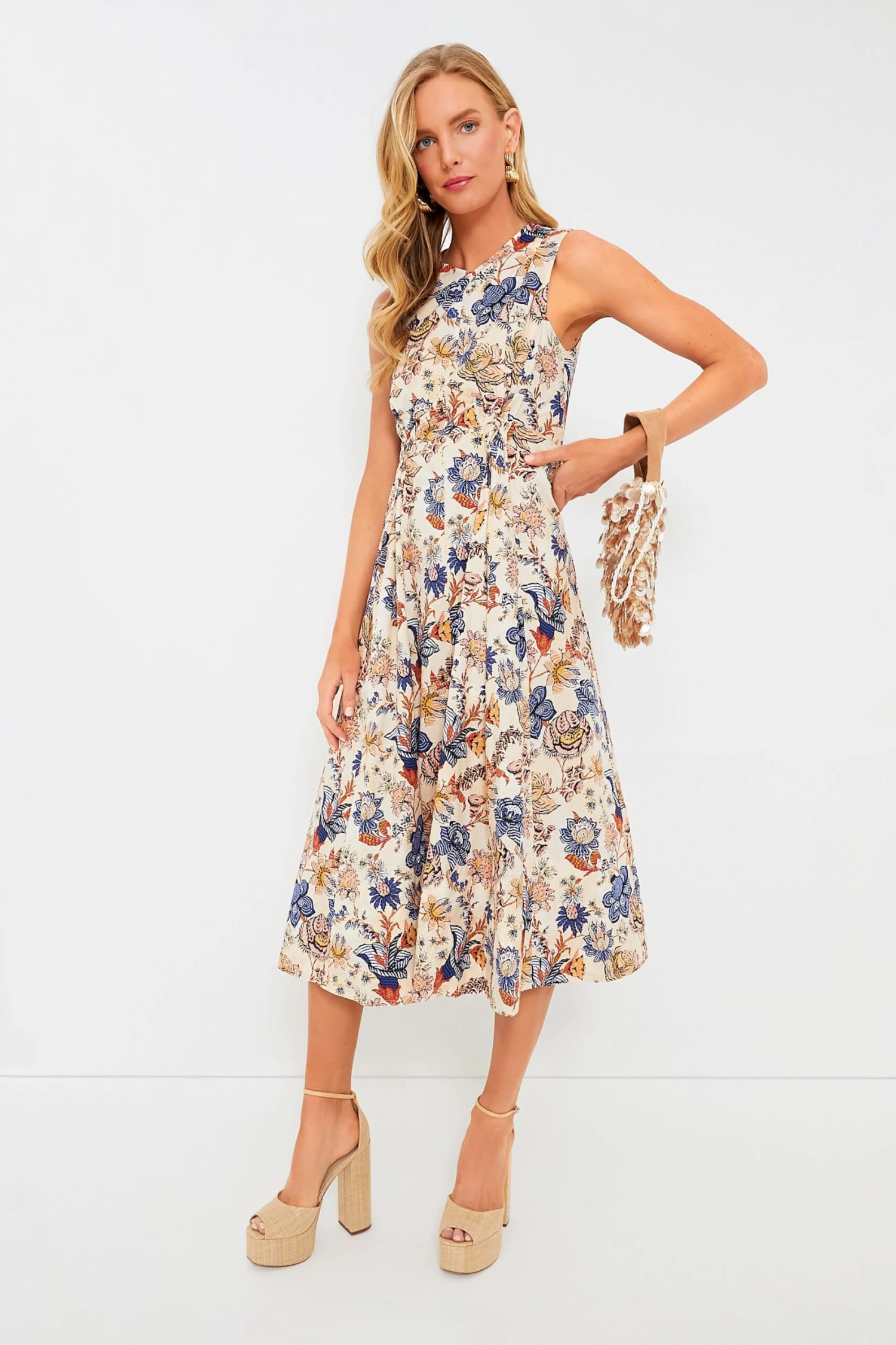The Kaiya Dress is adorned with Ulla Johnson’s vintage-inspired Magnolia print with captivating, hand-painted botanicals against a cream backdrop. Crafted with a high V-neckline, this sleeveless style features elegant pleating that frames the waist and a full midi skirt that moves beautifully. Pair with heels or platform sandals, a clutch, and gold jewelry for a look that will turn heads.Â