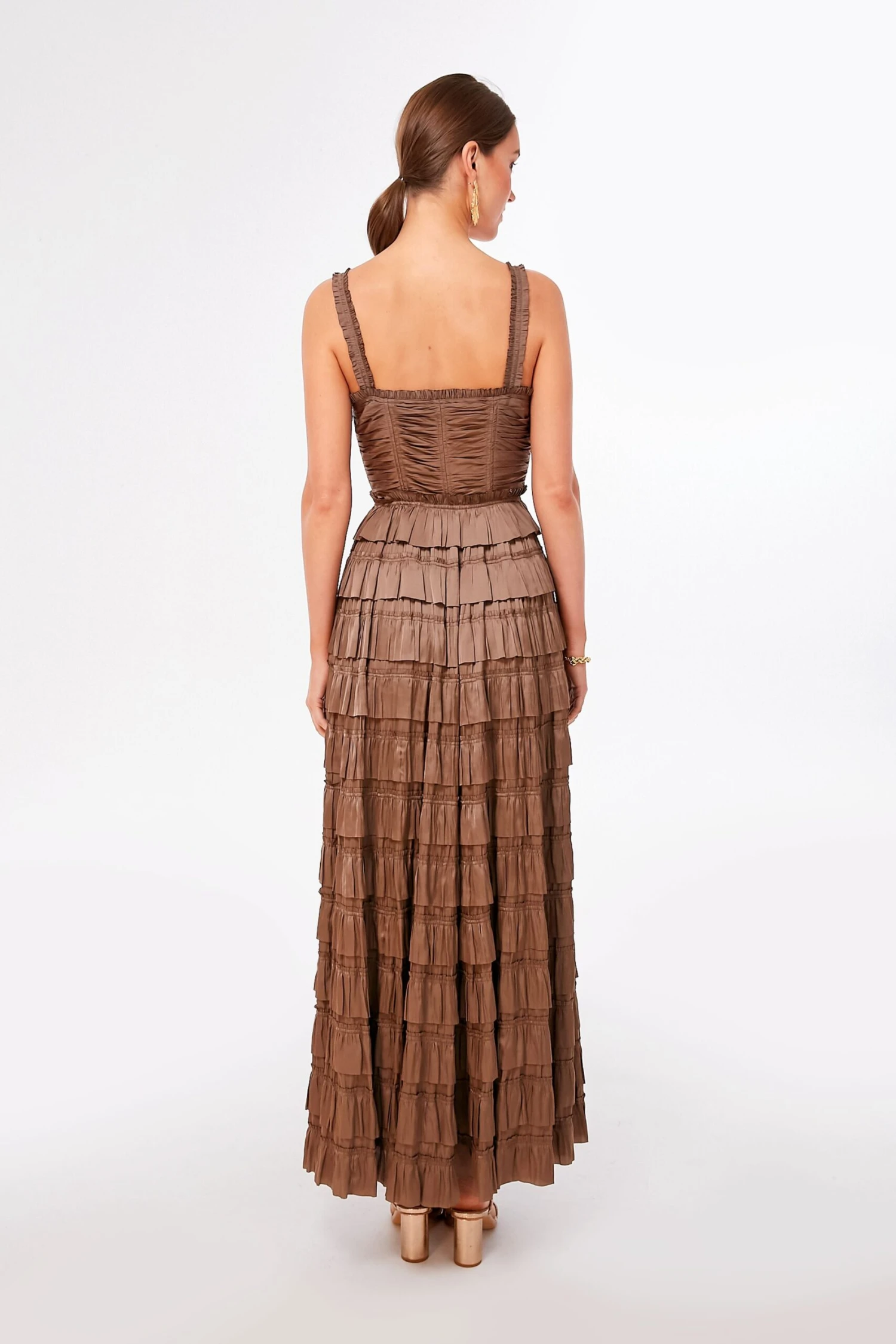 The Mica Camille Gown is made from sumptuous plissé satin in a natural caramel hue. This standout silhouette is gently gathered throughout the corset-style bodice and features gorgeously layered ruffles along the skirt. The details are endless– with the shoulder straps and nipped-in waist embellished by a series of delicate mini ruffles, embodying romantic femininity. Add heels and gold accessories for a look that is begging to be whisked away and twirled all night long!