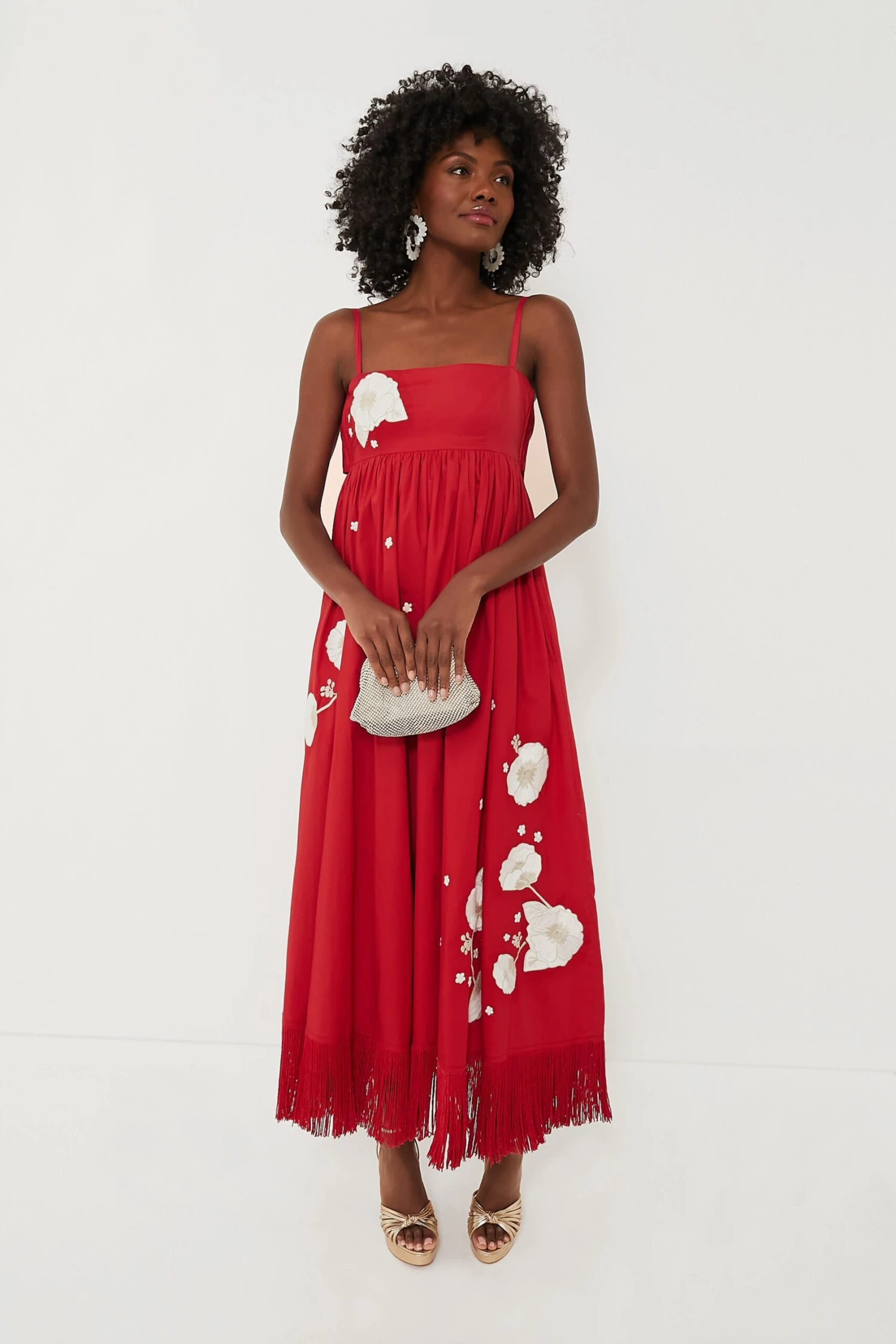 The Gavin is a captivating midi-length dress accented with fringe at the hem, hand placed embroidery embellished with pearl-like beads, and beadwork accents throughout. The playful flower motif and intricate beading add the perfect touch of whimsy. The full, flowing skirt and empire waist flatter your silhouette, and allow you to twirl and dance with ease.Â