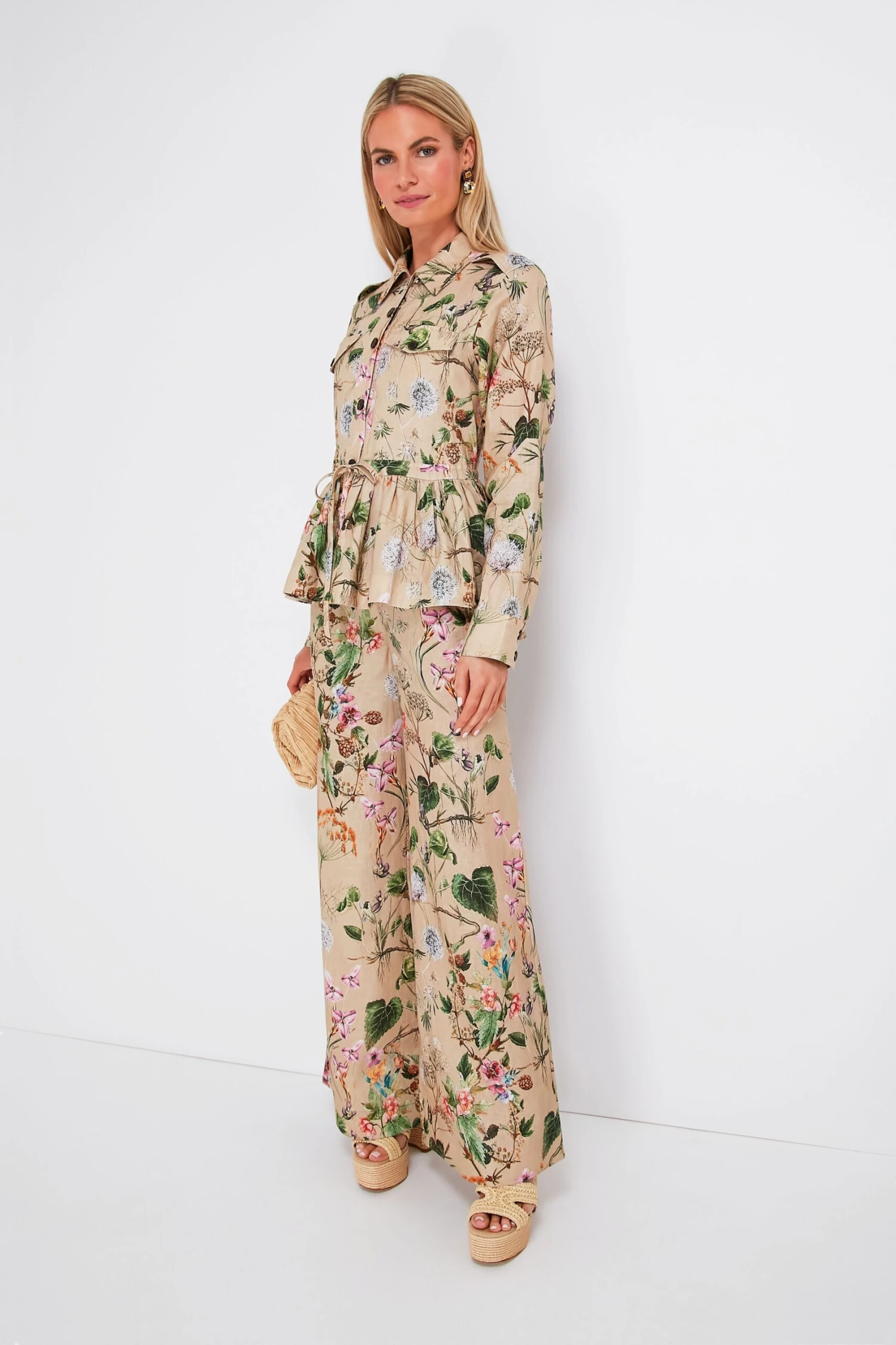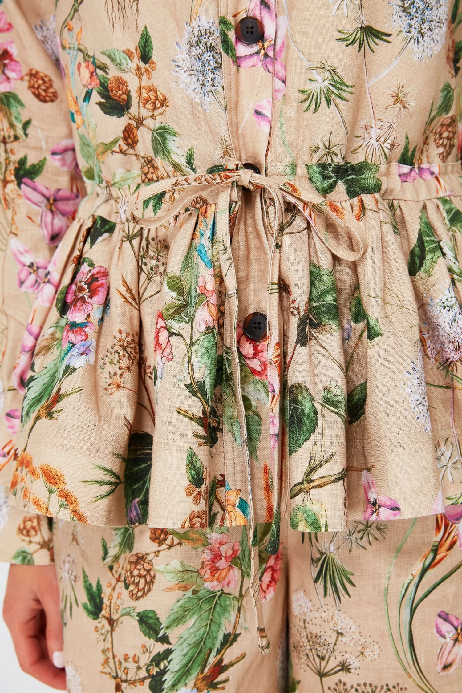 Go for a touch of daytime drama in the Whimsical Khaki Cory Jacket. In a neutral colorway with muted florals, this effortlessly feminine silhouette features a sophisticated point collar, a front placket with contrast buttons, and a flirty high-low peplum hem that can be exaggerated by pulling the drawstring waist. Cut from breezy linen, this unique layer can be paired with the matching pants for a cohesive look or worn over a basic tee to take things up a notch.
