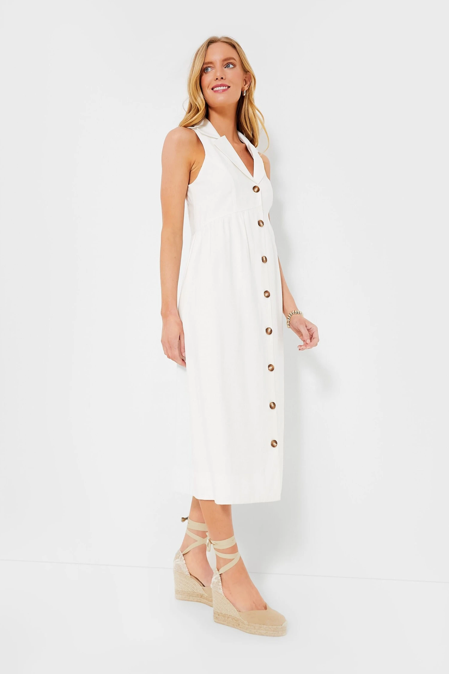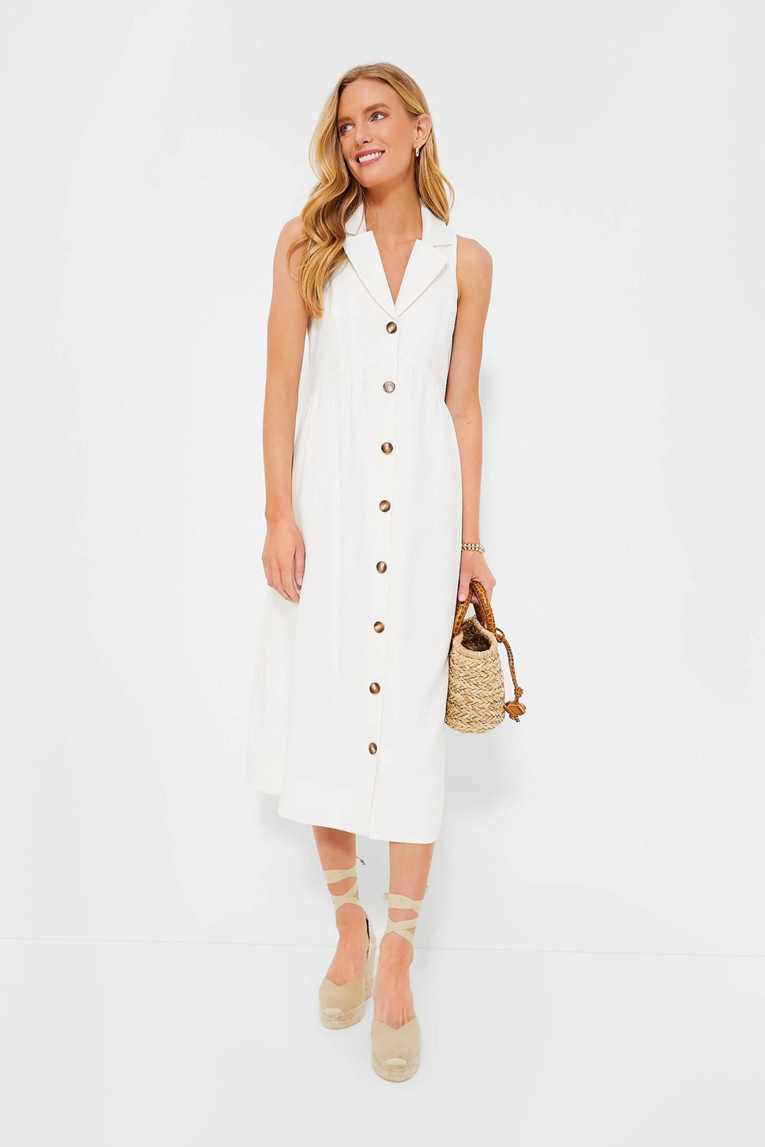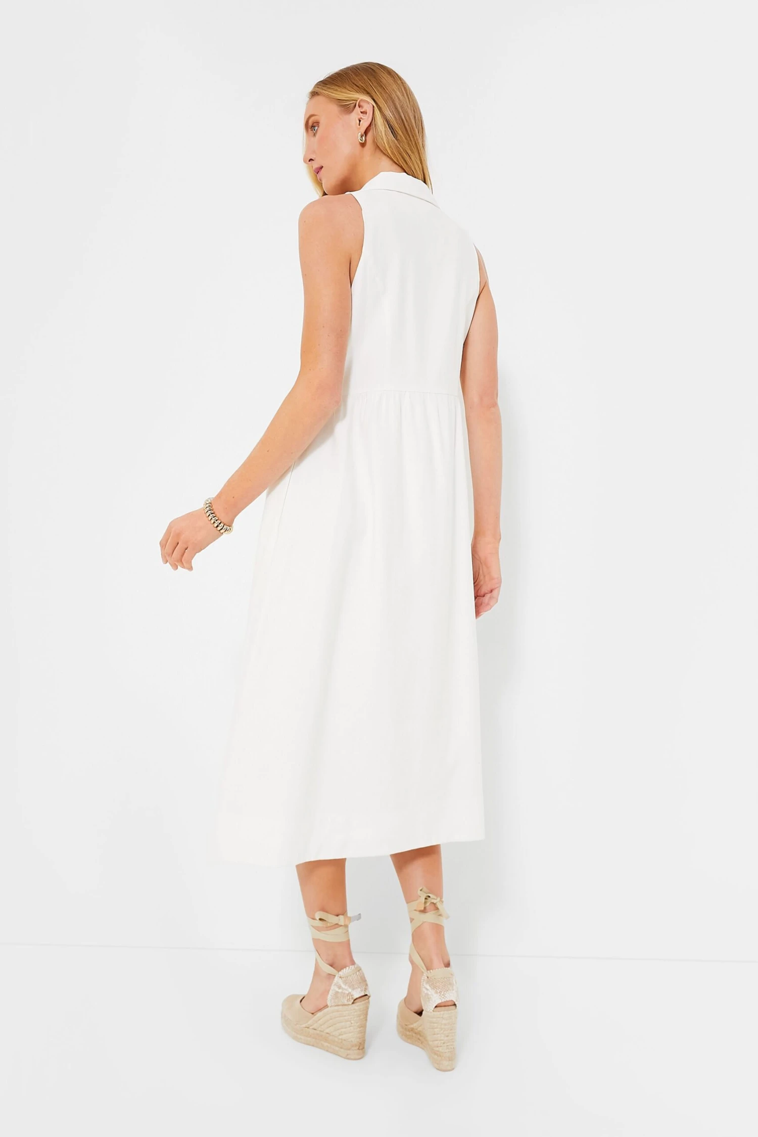 The perfect elevated daytime midi, the White Jules Dress was designed for effortless throw-on-and-go wear while still looking put together. The oversized collar gives a tailored feel while the breezy sleeveless silhouette makes it great for when the weather heats up — plus it has everyone’s favorite feature: pockets! From market runs to the office, flats to heels, this style staple can be styled multiple ways for endless occasions.Â